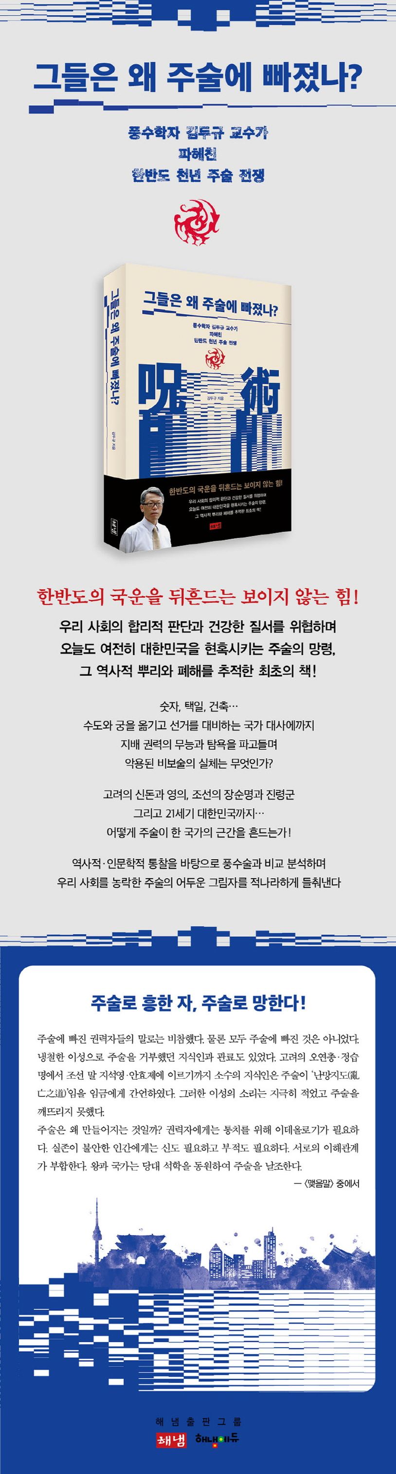 사실 한반도에서 정치 권력과 주술의 결탁은 그 역사가 깊다. 이에 풍수학자 김두규 교수는 고려시대부터 조선, 21세기까지 한반도에 벌어졌던 주술의 흐름을 파악하고, 그것의 폐해와 위험성을 살펴보고자 신작『그들은 왜 주술에 빠졌나?』를 펴냈다.