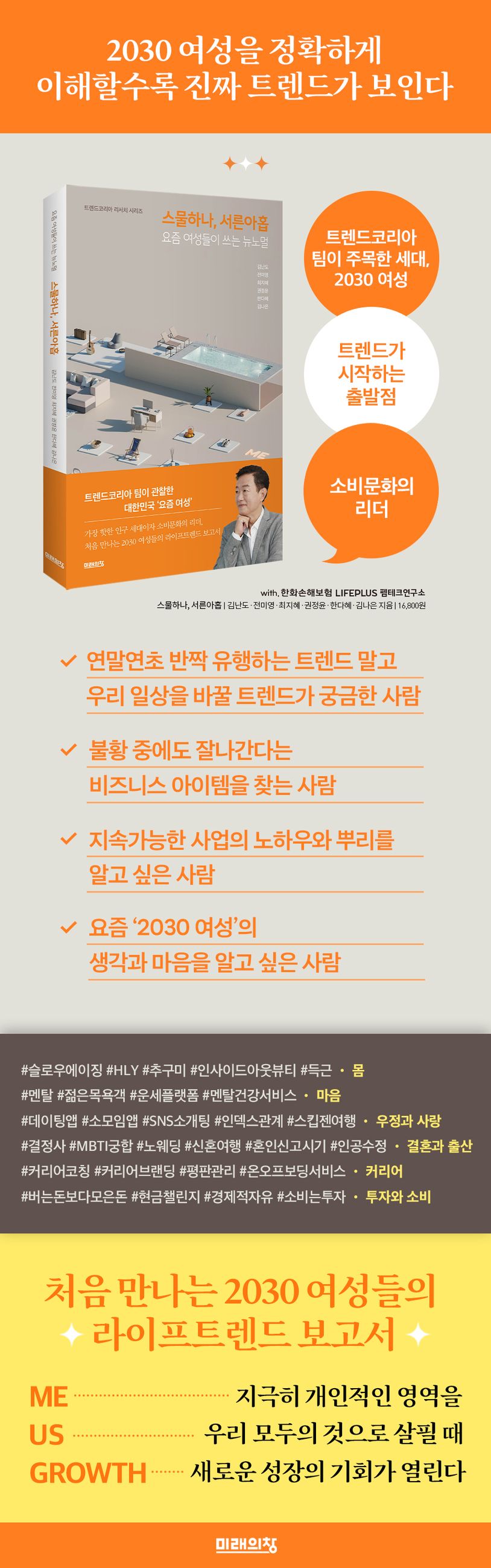 ‘2030 여성’ 하면 무엇이 제일 먼저 떠오르는가? 운동이나 명상 등 자기관리를 열심히 하는 모습, 연인이나 친구들과 핫플레이스를 찾아다니는 모습, 데이트는 물론 결혼과 출산을 거부하는 모습, ‘스드메(스튜디오, 드레스, 메이크업)’ 정보를 교환하며 결혼식 준비에 열을 올리는 모습, 릴스나 틱톡 영상 속의 모습 혹은 시위 현장의 모습까지… 김난도 교수를 필두로 한 ‘트렌드코리아 팀’은 전혀 다르고 상반되어 보이기까지 하는 이 모습들이 모두 2030 여성들의 모습이라 말한다. 하나로 정의되길 거부하고, 라이프스테이지마다 당연한 것은 없으며, 매순간 나다운 방법을 찾는 이들이기 때문이다. 그 과정에서 패션·뷰티·식품·케어 등 다양한 산업에서 중추적 역할을 하는 이들을 트렌트코리아 팀은 ‘트렌드가 시작하는 출발점’으로서 살펴봤다. 산업적으로 새로운 기회를 찾는 이부터 국가적으로 미래지향적인 청사진을 그리고 싶은 이, 나이와 성별을 떠나 동시대를 살아가는 사람들의 이야기가 궁금한 이들에게 인사이트가 되어줄 것이다.