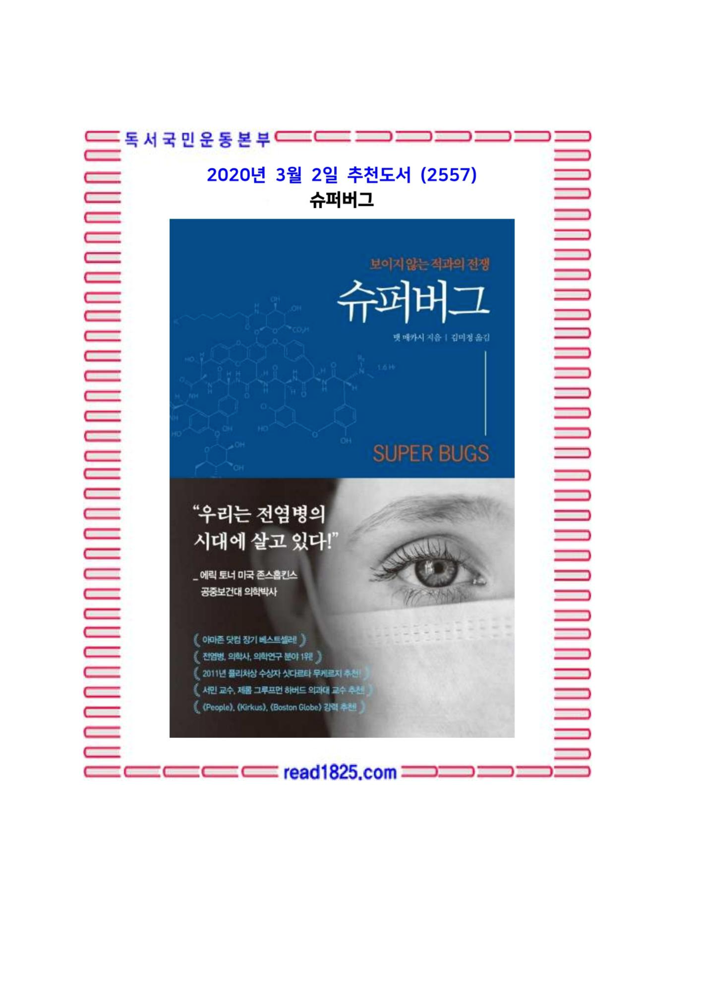신종 코로나바이러스 감염증에 대한 일각의 비이성적인 반응을 보면서 문제해결의 출발점은 인식이라는 사실을 새삼 실감하게 되는 요즘이다. 질병을 일으키는 박테리아, 진균, 바이러스는 변이를 거듭하며 우리 곁에 늘 존재해왔다. 그런데 근래에 와서 슈퍼버그의 문제가 심각해진 이유는 항생제의 오남용 때문이라고 한다. 역사를 돌이켜볼 때 대중의 관심과 인식만이 제도와관행의 변화를 가져왔다. 항생제 사용과 내성 발생 비율이 높은 편에 속할 뿐만 아니라 항생제 내성 발생률에 영향을 끼치는 가장 큰 요인인 인구밀도까지 높은 한국에 사는 우리에게는 이런 인식이 더욱더 필요하다고 본다.