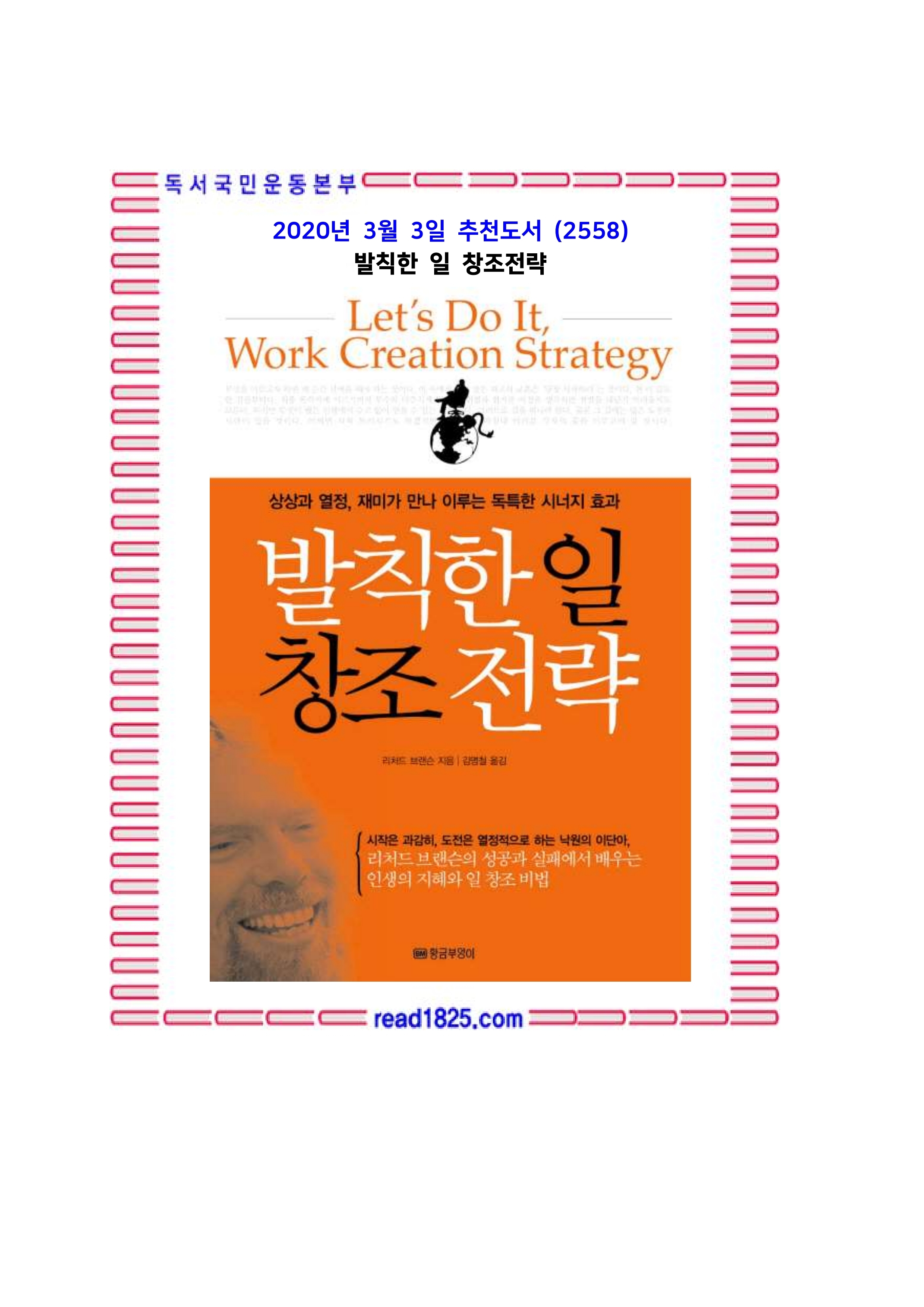 리처드 브랜슨의 성공과 실패에서 배우는 인생의 지혜와 일 창조 비법을 담아낸 에세이『발칙한 일 창조 전략』. 무일푼으로 시작해서 유럽의 거대 기업그룹을 일군 리처드 브랜슨의 성공비결을 담은 책으로 기발한 아이디어와 상상력을 넘어, 이를 실현에 옮기는 추진력 엿볼 수 있는 리처드 브랜슨의 이야기를 담아냈다.