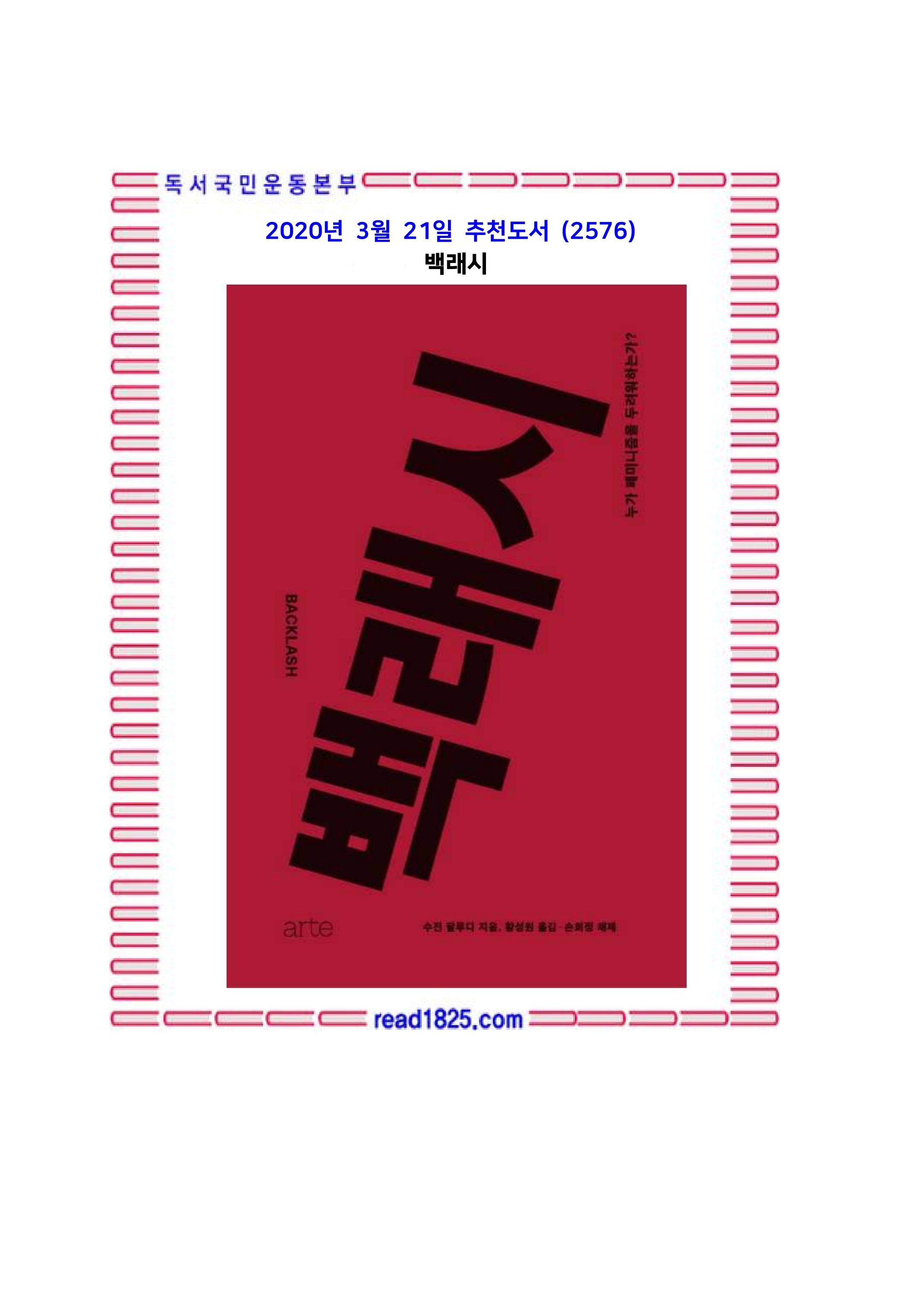 『백래시』는 페미니즘에 대한 반동이 특수한 시대적 상황의 산물이자 동시에 보편적 현상이라는 통찰을 제시한다. 이번에 출간되는 한국어판은 2006년 출간된 15주년 기념판을 판본으로 삼은 것이다. 1991년 출간된 『백래시』는 지금껏 번역되지 않은 것이 의아할 정도로 국내외 페미니스트들에게 꾸준히 영감을 불어넣었고, 페미니즘의 역사를 다룰 때 꼭 참조해야 할 필독서가 되었다. 또한 2007년 《유에스에이 투데이》 선정 ‘지난 25년간 미국에 영향을 미친 책 25권’에, 2011년 《미즈》 선정 ‘세대를 초월한 논픽션 베스트 10’ 목록에 이름을 올리며, 시대를 불문하고 끊임없이 소환되고 재인용되는 고전으로서의 가치를 재확인했다.