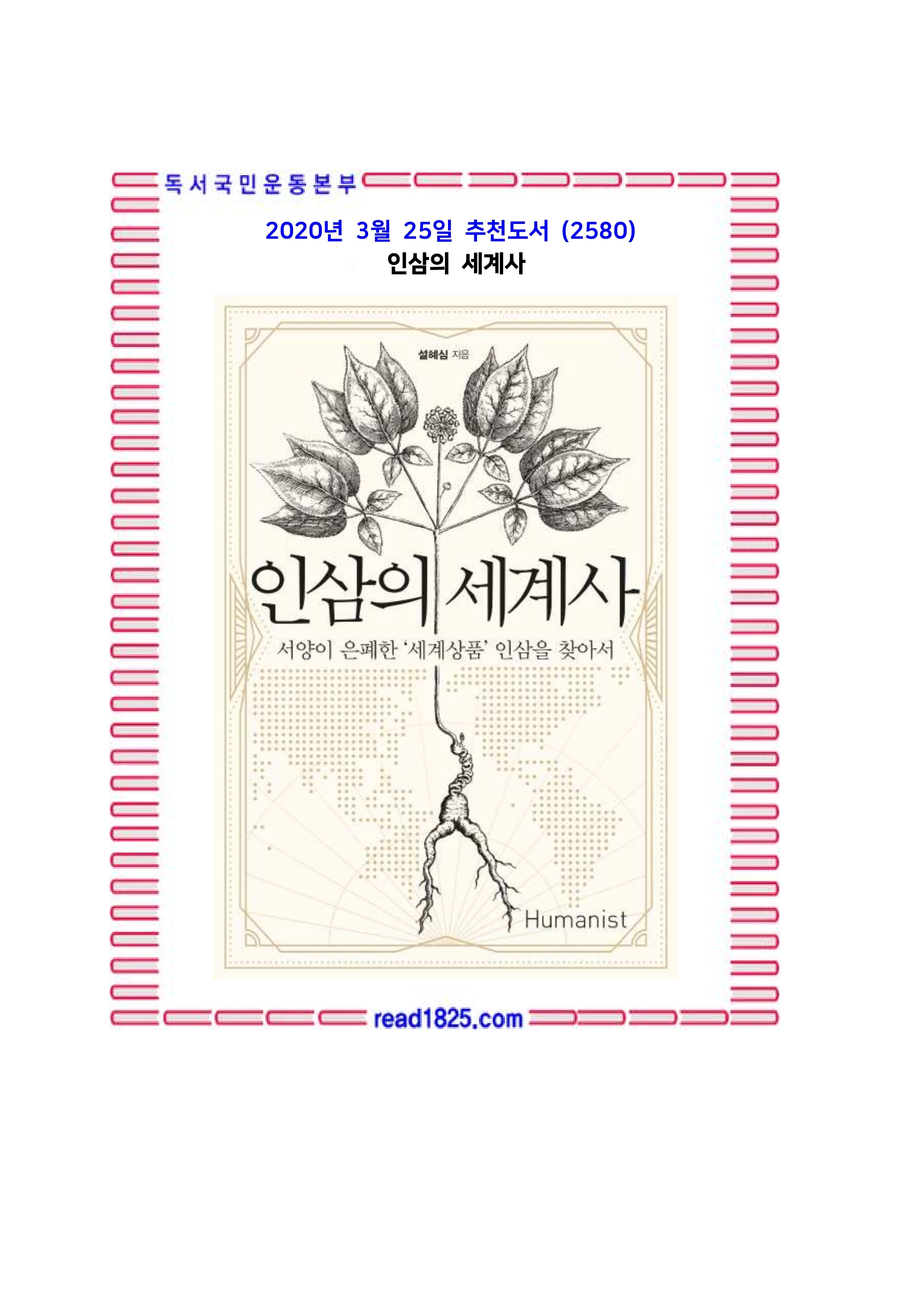 인삼 교역의 역사를 통해 한국인삼에 관한 서양의 인식도 확인할 수 있는데, 중국 사료에만 의존했던 탓에 한국인삼을 2등급으로 치부하다가 최고의 인삼으로 칭송하기도 하는 등 시대에 따라 인식의 변화가 나타난다. 조선의 대중국·대일본 인삼 교역의 역사는 물론, 19세기 한반도를 둘러싼 열강의 다툼 속에서 드러나는 한국인삼에 대한 서양의 관심과 욕망, 일본에 대항한 개성 삼업인들의 저항운동 등 흥미진진한 이야기가 펼쳐진다.