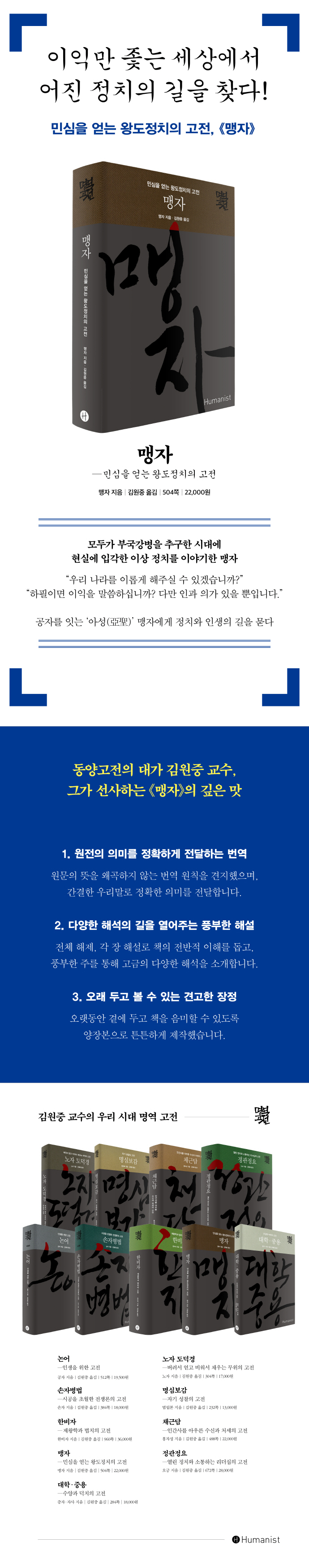 2016년 출간을 시작한 〈김원중 교수의 명역 고전〉 시리즈는 지금까지 《논어》, 《손자병법》, 《한비자》, 《대학·중용》, 《노자 도덕경》, 《명심보감》, 《채근담》, 《정관정요》 등 8권의 책이 출간되었으며, 《맹자》 출간을 마지막으로 완간되었다. 5년 동안 시리즈 누적 10만 부 이상 판매되며 서점가의 대표 동양고전 시리즈로 자리를 잡은 〈김원중 교수의 명역 고전〉 시리즈는 이제 독자들이 믿고 구입하는 하나의 브랜드가 되었다. 이번에 출간한 《맹자》 또한 원문을 왜곡하지 않고 유려한 우리말로 정확한 의미를 전달하는 번역, 전체 내용을 개괄하고 독서의 방향을 잡아주는 해제와 해설을 담았다. 조기, 주희, 초순, 정약용, 양보쥔 등 고금 주석가·학자의 성과를 두루 반영한 820여 개의 풍부한 각주는 넓고 깊은 연구를 바탕으로 이룬 학술적 성과인 동시에, 일반 독자들도 《맹자》의 깊은 맛을 느낄 수 있도록 한다. 난해할 수 있는 동양고전 이해를 돕는 〈김원중 교수의 명역 고전〉 시리즈는 앞으로도 옛사람의 지혜를 배우려는 독자들이 꾸준히 읽는 책으로 오래 남을 것이다.