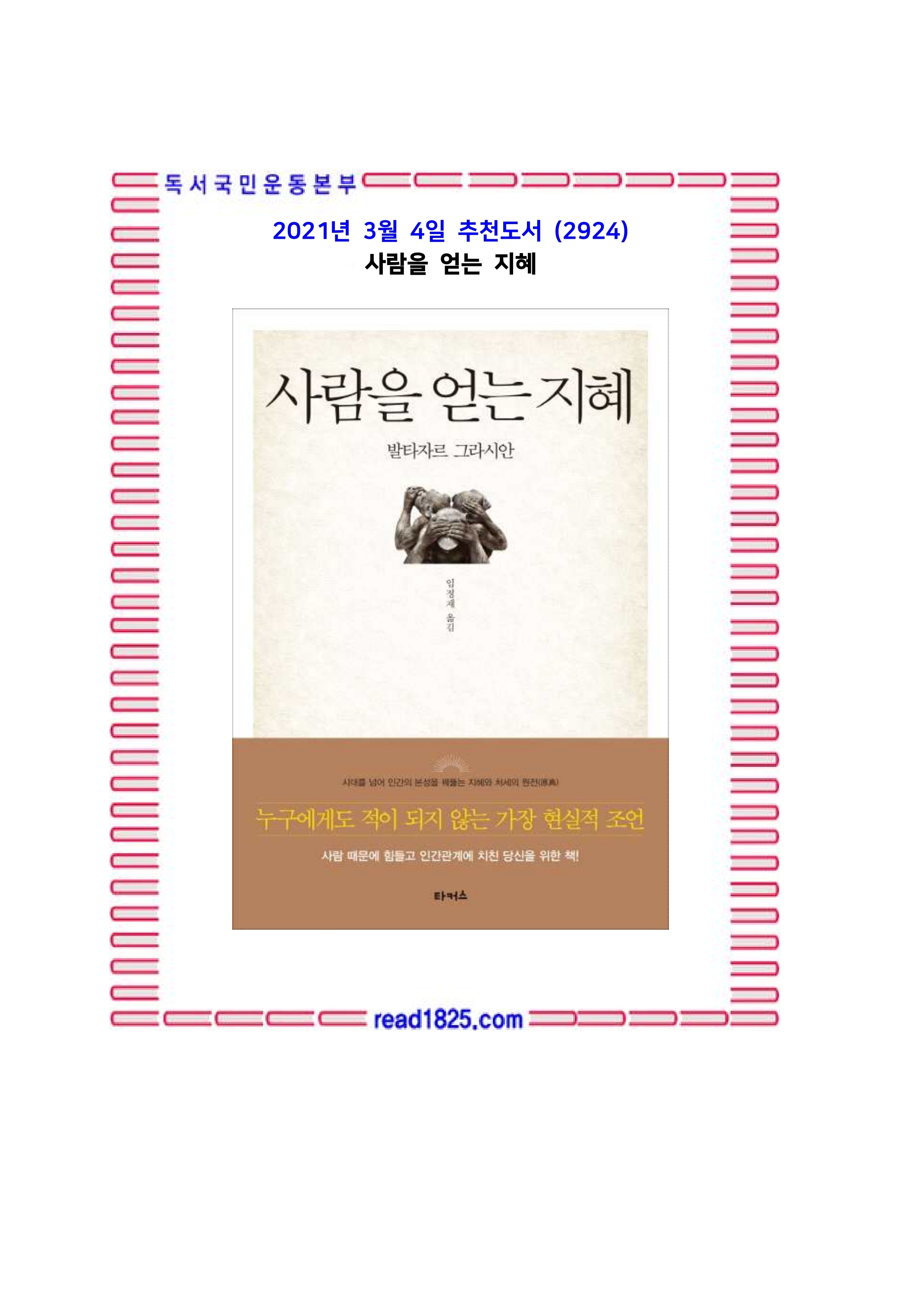 이 책은 이기적이고 불완전한 사람들이 서로 어울려 살아갈 때 알아야 할 지혜들로 가득하다. 인간으로서 지켜야 할 품위와 여러 가지 미덕을 강조하면서도, 한편으로 상대의 속셈을 간파하고 자신이 돋보이기 위해 상대를 적절히 이용하는 생활의 지혜도 알려준다. 지금 우리 사회는 그라시안이 살았던 17세기만큼이나 불신과 위선이 팽배해 있다. 유럽 최고의 지혜의 대가인 그라시안의 날카로운 통찰과 인생 지침들은 지금 우리 현실에 적용할 때 더욱 빛을 발할 것이다.