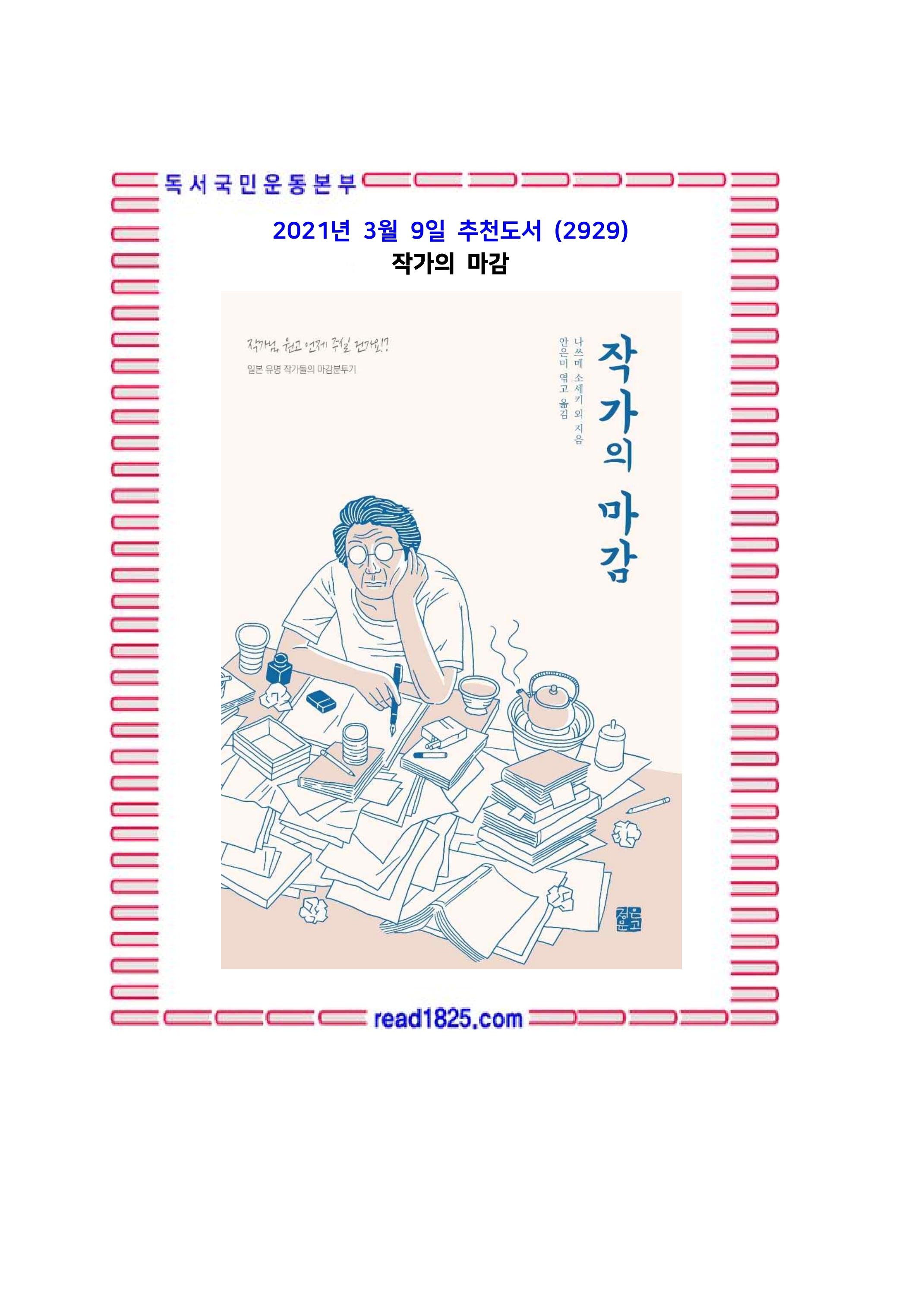 단숨에 글을 써 내려간다면 얼마나 좋을까. 그러나 명문은 고된 작업 속에서 탄생한다. 대문호라고 평가받는 작가들이 마감을 앞두고 벌이는 기발하고 엉뚱한 모습을 보면서 독자들은 평범한 우리와 똑같은 행동에 웃음을 짓는다. 왜냐하면 우리는 모두 마감을 겪으면서 살기 때문이다. 직장인이든 주부든 프리랜서든 아르바이트든 우리에게는 모두 마감이 있다. 때문에 이 책에 등장하는 작가들의 에피소드 하나하나가 전부 나의 이야기나 다름없다. 아이들조차 방학 숙제를 마감 안에 끝내지 못하는 괴로움이 있지 않은가.