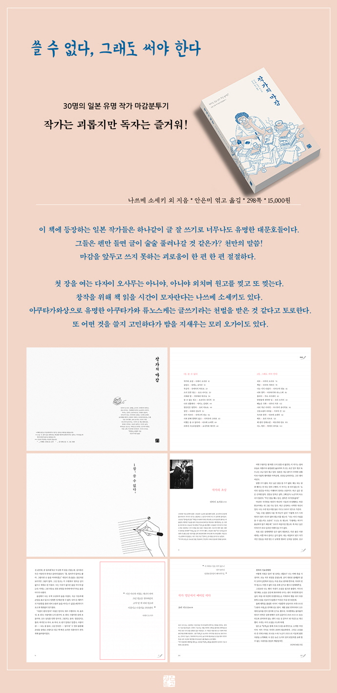 이 책에 등장하는 일본 작가들은 하나같이 글 잘 쓰기로 너무나도 유명한 대문호들이다. 그들은 펜만 들면 글이 술술 풀려나갈 것 같은가? 천만의 말씀! 마감을 앞두고 쓰지 못하는 괴로움이 한 편 한 편 절절하다. 첫 장을 여는 다자이 오사무는 아니야, 아니야 외치며 원고를 찢고 또 찢는다. 창작을 위해 책 읽을 시간이 모자란다는 나쓰메 소세키도 있다. 아쿠타가와상으로 유명한 아쿠타가와 류노스케는 글쓰기라는 천벌을 받은 것 같다고 토로한다. 또 어떤 것을 쓸지 고민하다가 밤을 지새우는 모리 오가이도 있다. 글 잘 쓰기로 유명한 이 작가들의 마감분투기도 또 하나의 명문이 탄생하는 순간이다. 하지만 대문호답게 절절매는 자신을 그린 문장도 모두 명문이다.
