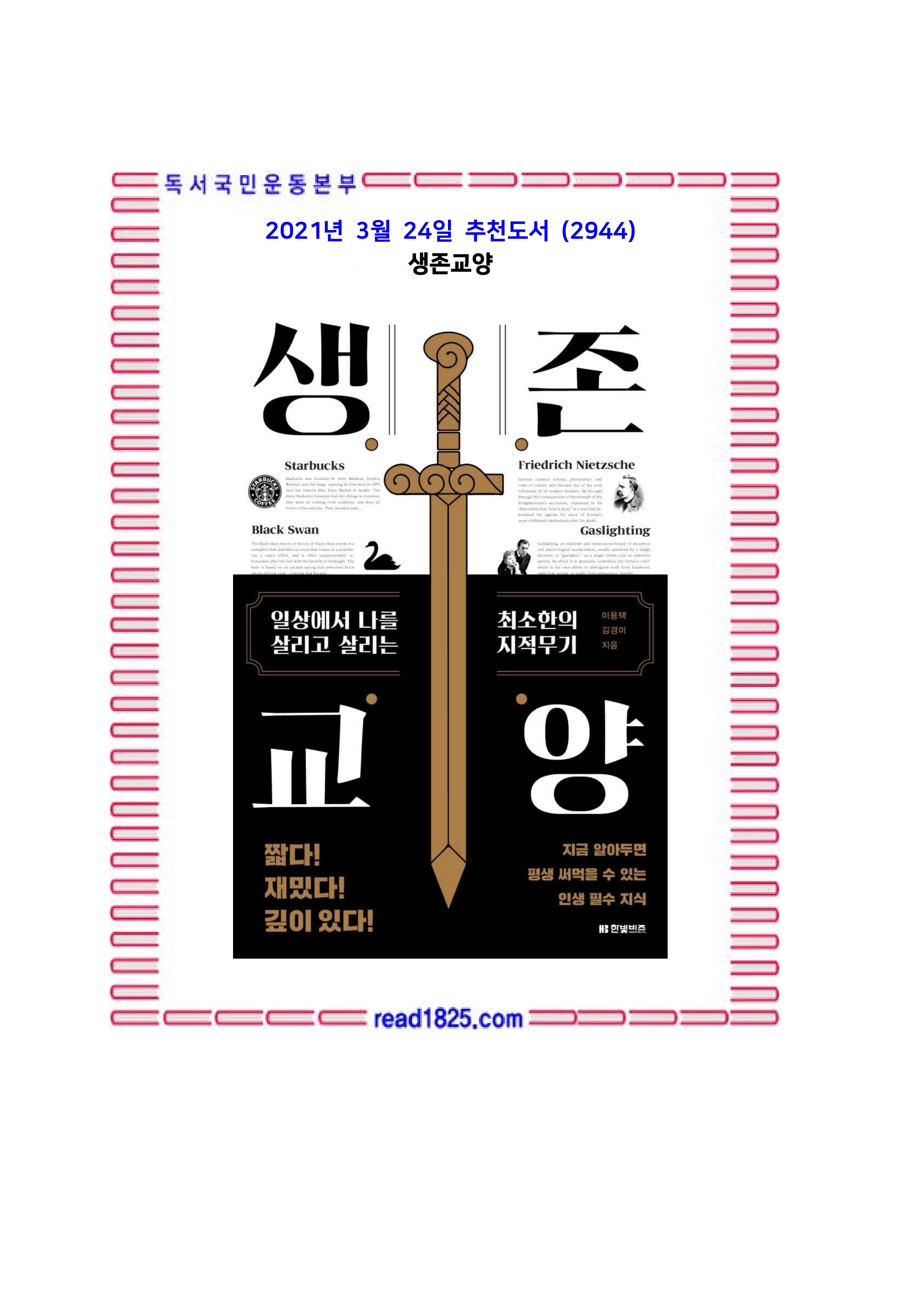 ‘나만의 지적 유레카’가 쌓이는 세상 편한 교양 수업『생존교양』. 교양은 쌓고 싶은데 어디서 시작해야 할지 헤매는 사람들, 자신만의 교양 공부가 쉽게 안 되는 사람을 위한 책이다. 보통 사람들이라면 알고 있거나 알아야 하는 지식 용어 150개를 선정해, 해당 단어에 얽힌 사연과 역사적 배경, 변천사, 그리고 그 속에서 읽어낼 수 있는 교훈적 메시지 등을 담았다. 즉, 필수 지식을 스토리텔링으로 쉽게 풀이한 것이다.
