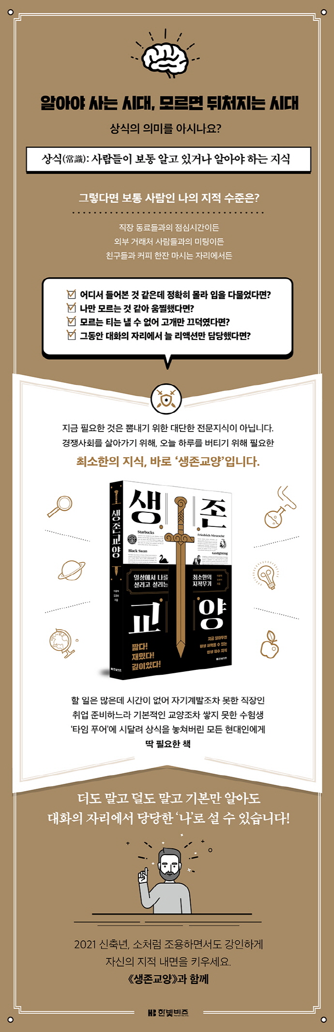 앞을 내다보기 어려운 요즘, 우리는 생존의 시대를 살고 있다고 말하는 이들이 많다. 장기적인 재테크를 포기하고 지금 당장을 걱정하는 사람들이 많은가 하면, 몸짱보다는 그저 오늘 하루를 살기 위해 체력을 키우는 사람이 많다. ‘버텨야 하는’ 시대이고, ‘해야 할 일에 집중해야 하는’ 시대라고 말한다. 지식의 세계도 다를 바 없어서, 이제는 ‘알아야 살 수 있는 시대, 모르면 모를수록 뒤처지는 시대’라고 해도 가히 지나치지 않다. 결국 지금 우리에게 필요한 것은 뽐내기 위한 전문지식이 아니라 이 사회를 살아가기 위해 꼭 요구되는 ‘생존교양’이다.