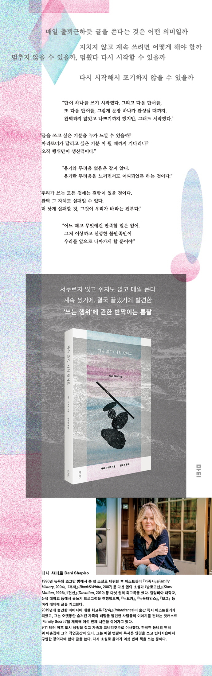 대니 샤피로는 이십 대 후반에 첫 소설로 데뷔했다. 그때부터 작가라 불리며 지내온 지 20여 년, 어릴 적부터 매일 글을 쓰며 살아온 지 40여 년이 지난 무렵에 쓴 『계속 쓰기』는 그가 작가로 살아가는 일, 밤마다 이불 밑에서 손전등을 켜고 상상으로 가득한 편지를 끄적거리면서 시작된 글 쓰는 생활을 톺아보며 써내려간 책이다. 오로지 계속 썼기 때문에 나올 수 있었던 책이다.