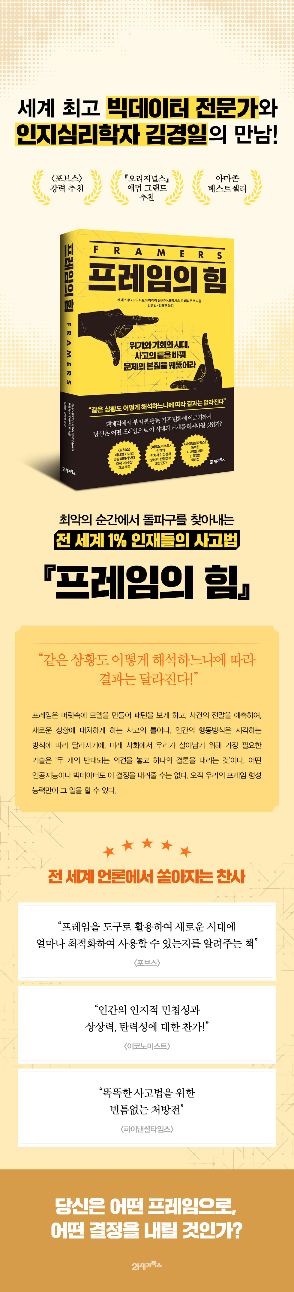 인류는 우리의 존재를 위협하는 전례 없는 도전에 직면해있다. 팬데믹이든 포퓰리즘이든, 새로운 무기든 새로운 기술이든, 지구온난화든 불평등의 심화든, 이에 대한 인간의 반응 방식이 생존과 소멸을 가른다. 인간의 행동방식은 인간이 지각하는 방식에 따라 달라지기에, 앞으로 펼쳐질 미래 사회에서 우리가 살아남기 위해 가장 필요한 기술은 ‘두 개의 반대되는 의견을 놓고 하나의 결론을 내리는 것’이다. 어떤 인공지능이나 빅 데이터도 우리를 위해 결정을 내려줄 수는 없다. 오직 우리의 프레임 능력만이 그 일을 할 수 있다. 당신은 어떤 프레임으로 세상을 바라보고, 어떤 결정을 내릴 것인가?