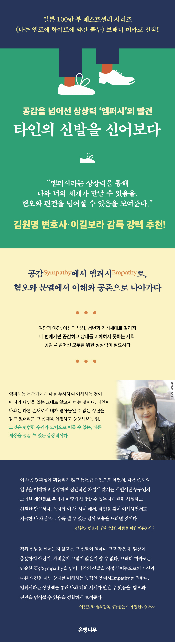 252쪽의 책에서 단 4쪽밖에 나오지 않는 단어가 어째서 사람들에게 이토록 특별한 인상을 주었는지는 여전히 수수께끼다. 나름대로 추리하자면 ‘엠퍼시’를 다룬 책이나 기사는 전부터 일본에 많이 소개되었지만 대부분 ‘엠퍼시’를 ‘공감’이라는 단어로 번역했고, 사람들이 이에 위화감을 느껴왔던 게 아닐까. 다들 오래전부터 ‘공감하지는 않지만 타인을 이해하는 일’을 표현할 말을 찾지 못하다가, ‘타인의 신발을 신어보는 일’이라고 간단하게 설명한 ‘엠퍼시’라는 단어에 고개를 끄덕이게 된 것은 아닐까.