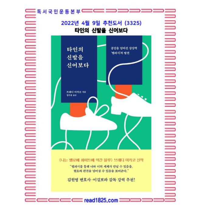 엠퍼시가 충만한, 모두가 나서서 서로의 신발을 신어보는 사회는 나의 ‘친구’를 응원하고 ‘적’을 이해하며 타인의 사정을 헤아려 서로를 돕는 세상일 것이다. 이 책은 우리에게 갈등과 분열의 ‘심퍼시’의 시대에서 이해와 공존의 엠퍼시의 시대로 나아가는 시작점이 될 것이다.