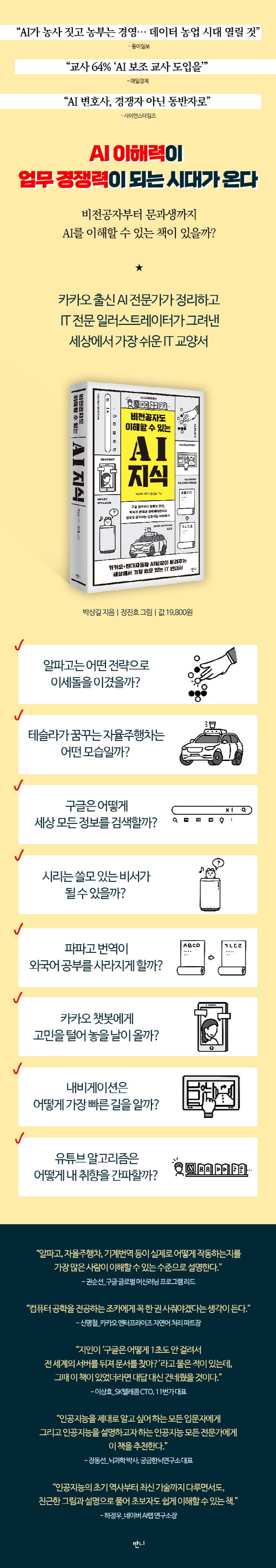이 책, 《비전공자도 이해할 수 있는 AI 지식》은 이처럼 인공지능이란 도구가 주어진 시대에, 다양한 사람이 인공지능을 이해하고 자신의 분야에서 활용할 수 있게 돕기 위해 쓰였다. 관련 공부를 해본 적 없는 사람들, 과학ㆍ수학이 낯선 문과생까지도 인공지능 기술의 역사와 원리를 이해할 수 있게 교양 수준으로 쉽게 풀어냈다. 저자는 인공지능 기술을 곧 우리 삶 전반에서 일상적으로 활용하게 될 것이라고 말한다. 처음에 특정 집단만 사용했던 스마트폰이 채 10년도 되지 않아 우리나라 성인 95%가 사용하게 된 것처럼 말이다. 이제는 마냥 인공지능을 두려워하거나 어려워할 게 아니라, 농업부터 사무직까지 어떤 분야에서든 인공지능을 접목하고 활용해 줄 아는 사람만이 시대의 요구에 따라갈 수 있다고 말한다.