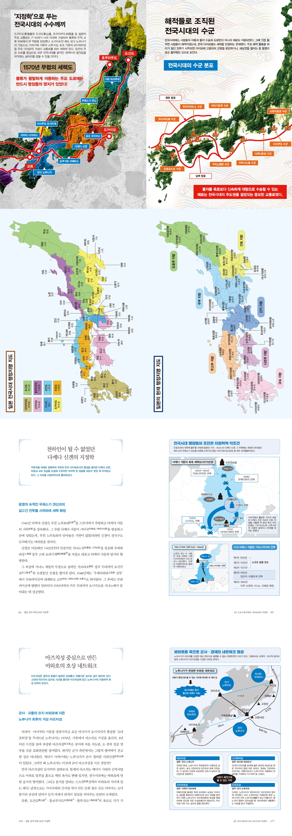 책머리에 수록한 컬러지도 중 수확량을 통해 평가한 주요 다이묘들의 세력도와 당시 주요 도로에 있는 다이묘의 영지와 거성은 권력의 움직임을 한눈에 파악할 수 있게 한다. 그리고 전국시대의 전투가 육지에서만 일어난 게 아니라 주변 해로를 장악한 해적과 다이묘들이 연합해 일으킨 해전도 전쟁의 주도권 다툼에 큰 영향을 미쳤음을 보여준다.