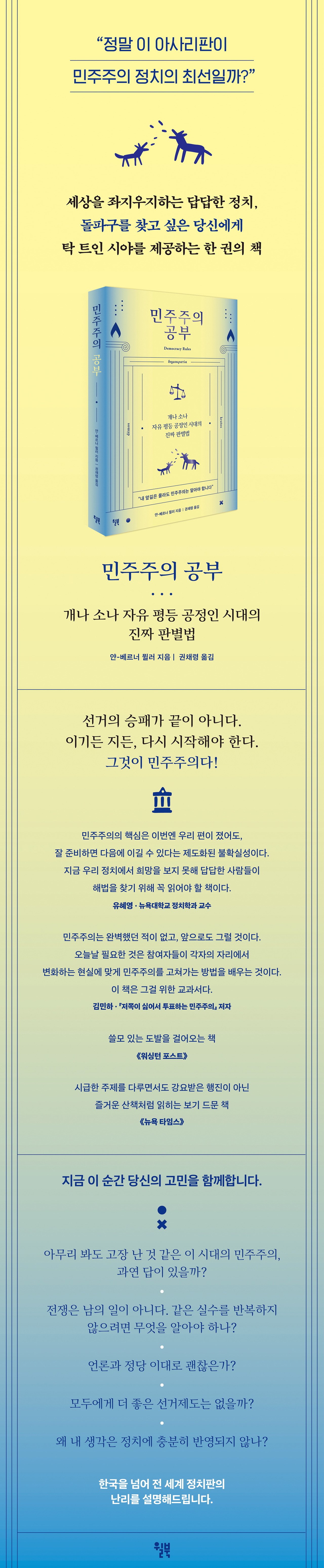 이런 가운데 출간된 『민주주의 공부(Democracy Rules)』는 정말 제대로 된 민주주의 사회에서 살고 싶은 시민들이 꼭 알아두어야 할 사실들을 짚어주는 책이다. 이 ‘아사리판’이 민주주의의 최선이 맞는지, 선거는 매번 왜 이 모양인지, 심판은 제대로 이루어진 것인지, 세상이 제대로 가고 있는 게 맞는지, 까딱하다 전쟁이라도 나는 건 아닌지, 대체 다들 뭐가 문제인지… 허울 좋은 민주주의 뒤에 암울한 미래가 기다리고 있을까 걱정인 이들에게 이 책은 지금 이 순간 가장 필요한 분석과 통찰을 제시한다.