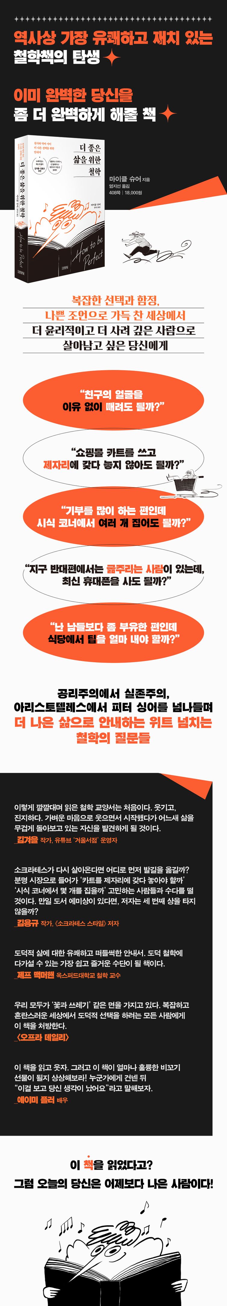 출간 즉시 뉴욕타임스 논픽션 베스트셀러에 오른 화제작! 모두가 좋은 사람이 되고 싶어 하지만 어쩌면 아무도 좋은 사람이 아닐 수 있는 시대, 바로 당신에게 필요한 철학 생존 키트! 누구나 빠지는 윤리 딜레마의 상황과 철학적 해법을 유쾌하게 풀어낸 《더 좋은 삶을 위한 철학》(원제: How to Be Perfect)이 출간됐다. 마트에서 장 보고 난 뒤 쇼핑 카트를 굳이 제자리에 돌려놓아야 할까? 백만장자는 식당에서 팁을 얼마나 내야 할까? 지구에는 가난에 고통받는 사람들이 있는데 나는 아이폰을 사도 될까? 사회적 논란을 일으킨 배우의 영화를 봐도 될까? 지금 먹고 있는 샌드위치에 들어간 햄은 윤리적으로 만들어진 게 맞을까? 수천 년 동안 ‘좋은 삶이란 무엇인가’를 고민해온 철학자들의 지혜를 빌려 일상에서 맞닥뜨리는 다양한 난제들에 유머러스하지만 깊이 있는 답안지를 제공한다. 저자 마이클 슈어는 〈SNL〉 〈더 오피스〉 등을 성공시킨 스타 프로듀서로, 드라마 〈굿 플레이스〉를 제작하며 누구나 즐길 수 있는 윤리 철학 개론서를 쓰겠다는 목표를 세웠다. 드라마 때부터 인연을 맺은 철학자 토드 메이의 도움을 받아 ‘평범한 사람들을 위한 생활 윤리학’이라는 콘셉트를 책에 담았다.