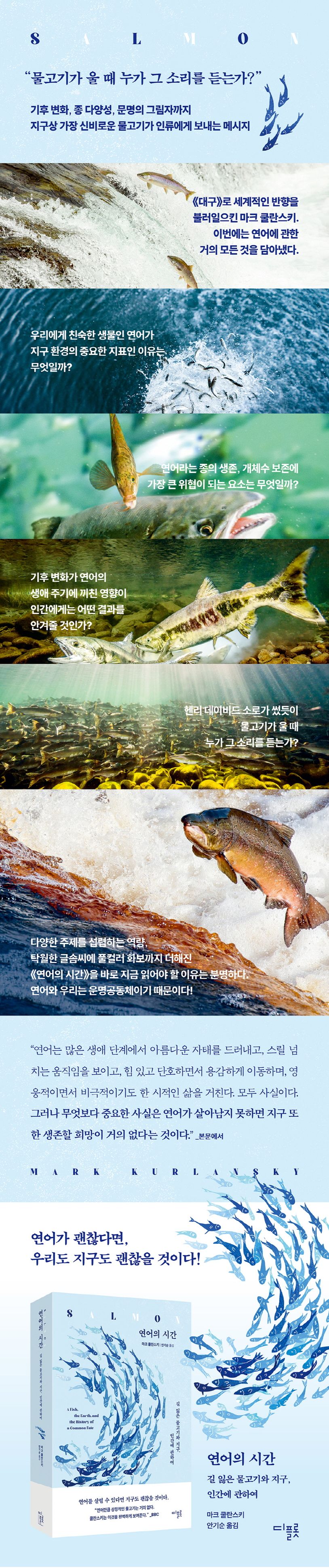 원주민은 자연과 문명으로 세계관을 분리하지 않는다. 하나의 세계가 있을 뿐이다. 그들이 연어를 바라보는 태도는 ‘하나의 지구’라는 관점을 상기시킨다. 쿨란스키가 이 책을 통해 전하려는 메시지와도 맞닿아 있다. 연어와 우리가 운명공동체라는 점이다. 더 늦기 전에 연어라는 신비로운 생물이 지구에서 영원히 사라지지 않도록 멈춰야 하는 것과 노력해야 하는 것들을 살펴보아야 할 때다. 바로 지금, 우리가.