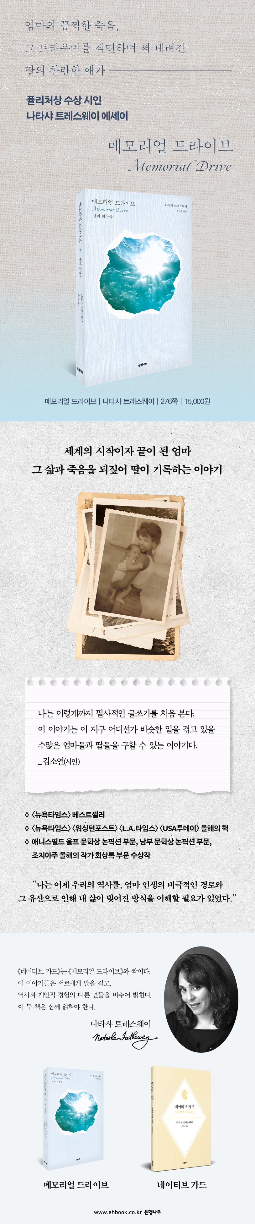 《메모리얼 드라이브》는 바로 그 상처를 직시하고 극복해나가는 과정이다. ‘절대 치유되지 않는 상처’를 치유하는 글쓰기가 아니라, 외면하고 있던 상실과 고통을 정면으로 마주하고 그 속을 통과하면서 엄마의 죽음을 제대로 애도할 수 있게 해준 승화의 글쓰기. 너무 거대하고 극심하여 미처 소화하지 못했던 슬픔을 나타샤 트레스웨이는 이 회상록을 쓰는 행위를 통해 비로소 받아들일 수 있게 된다.