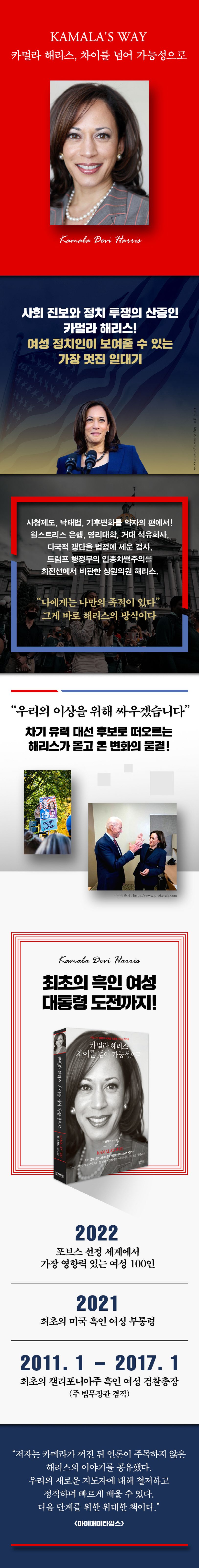 조 바이든 이후의 유력한 대통령 후보로 꼽히는 정치가, 2022년 〈포브스〉가 선정한 세계에서 가장 영향력 있는 여성 100인 중 한 사람. 흑인 여성으로는 최초로 캘리포니아주 검찰총장에 선출되고, 미국에서 여성과 유색인종에게 가장 배타적인 연방 상원의원을 역임했으며, 2020년 조 바이든의 러닝메이트로 지명되어 미국 최초의 흑인 여성 부통령으로 당선된 카멀라 해리스. 노련한 기자 댄 모레인이 가장 오래, 가장 가까이에서 해리스라는 독특한 정치인의 성장배경과 주변 인물, 경력, 세계를 움직이는 거물 정치인이 되기까지의 진화 과정을 세밀하게 그려낸 《카멀라 해리스, 차이를 넘어 가능성으로》(원제: Kamala’s Way)가 출간되었다.