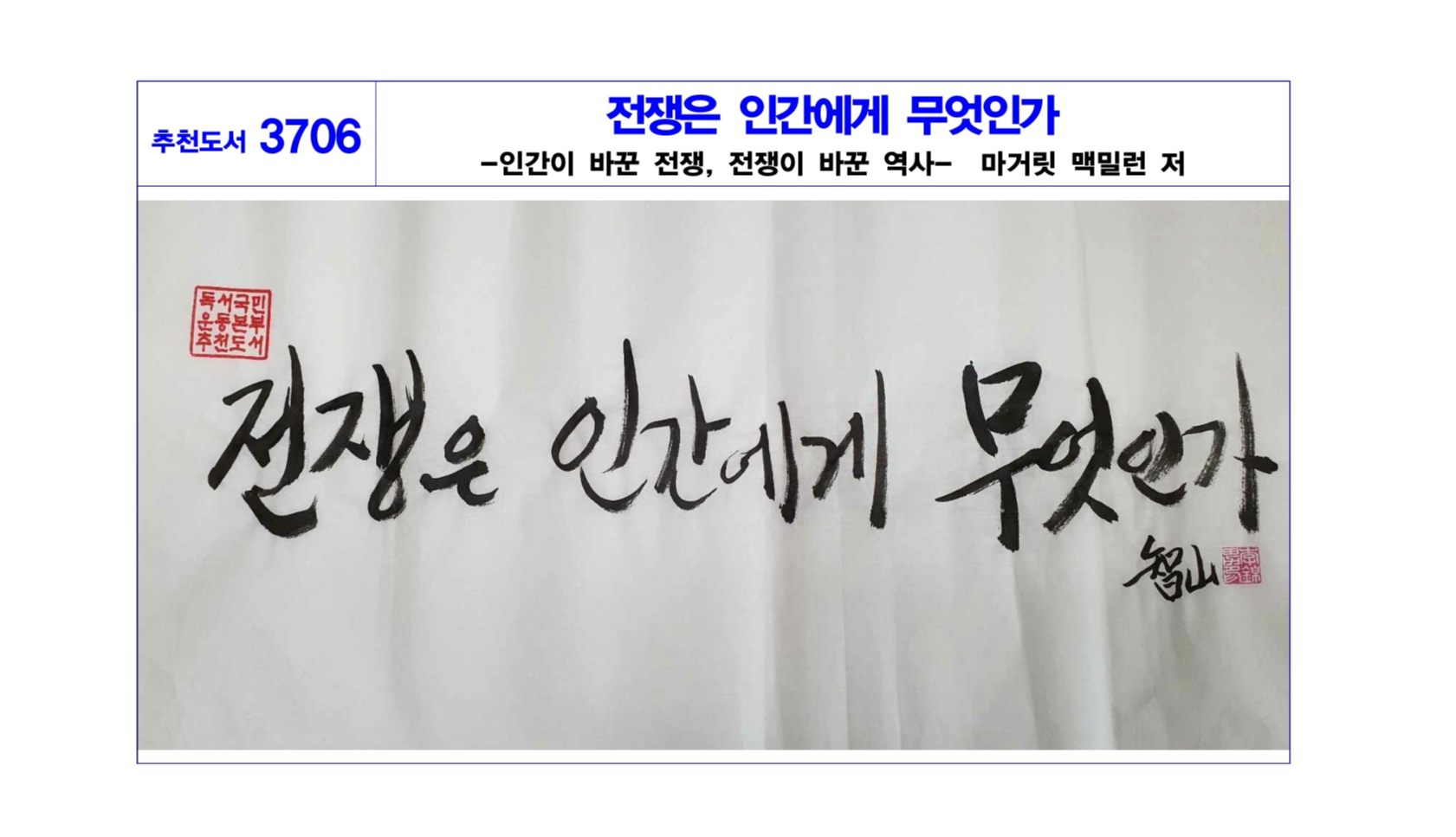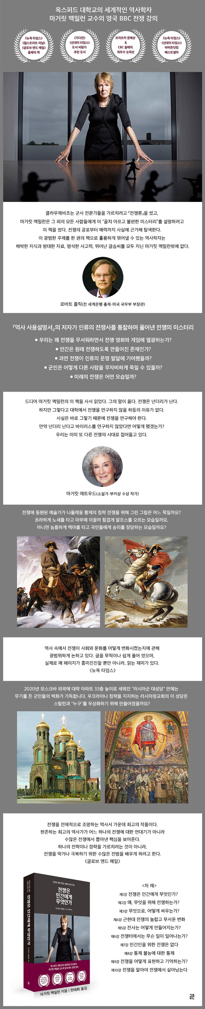 역사학자 마거릿 맥밀런은 전쟁이 무엇이고 그것이 국가에 어떤 의미가 있는지 등에 관한 오해를 바로잡는다. 전쟁의 역사를 개괄하면서 저자는 독자들에게 전쟁이 어마어마한 재정적 영향을 미친다는 점을 상기시킨다. 루이 14세는 더 이상 전비를 차관할 수 없게 되자 매우 불리한 조건으로 화평 조약을 맺어야 했다.…… 또한 맥밀런은 침략 전쟁, 방어 전쟁, 내전의 차이와 그로 인한 결과도 보여준다.…… 한편, 기술과 전쟁은 서로 긴밀한 관계여서, 전쟁으로 인한 기술의 발달이 문화와 사회에 좋거나 나쁜 영향을 미치는데, 최근 수십 년간 특히 그러했다. 역사 속 전쟁 중 상당수는 기술 혁신을 낳았고 그것은 다음 혁신이 일어나기 전까지 건재했다. 맥밀런은 문학, 경제, 기술, 전략, 전술, 그리고 심지어 음악, 미술, 문학, 영화 등에서 전쟁 요소를 그러모아 전장의 연기를 걷어내고 전쟁의 내적 구조와 영향을 드러내 보인다. 이 책은 해박한 지식을 종합하여 명료하게 써낸 작품이라서 많은 독자의 사랑을 받을 것이다.