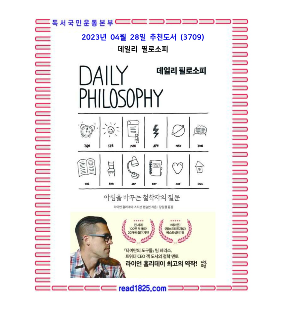 스토아 철학자들은 아침의 선구자이며 밤의 사제라고 불렸다. 그들은 일찍부터 삶을 준비했고, 저녁엔 사색에 잠겼다. 『데일리 필로소피』는 이들의 실천법에 영감을 받아 만들어졌다. 366일로 책이 구성된 것은 하루 한 번의 사색을 의미한다. 우리는 사색하는 시간을 통해 가장 먼저 삶의 목적과 방향을 찾아야 한다. 그래야만 내가 하고 싶은 일이 어떤 것인지, 내가 바꿀 수 있는 것과 없는 것이 무엇인지 알 수 있으며 시련이 닥쳐도 실망하거나 후회하며 주저앉는 대신 앞으로 나아갈 수 있다.