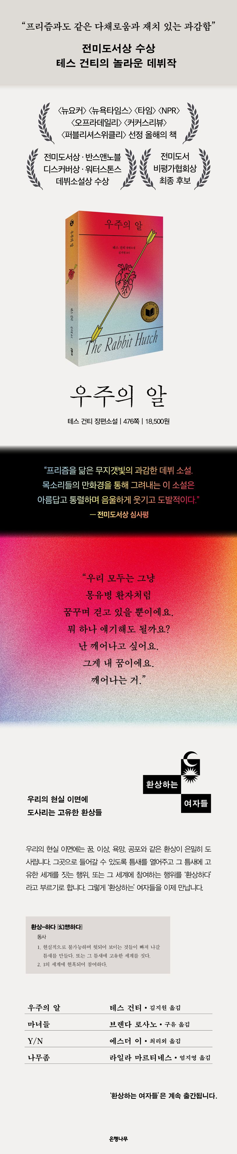 데뷔 소설로 전미도서상을 수상하며 단숨에 미국 문단의 스타로 떠오른 테스 건티의 장편소설 《우주의 알》이 은행나무출판사에서 새로 론칭하는 ‘환상하는 여자들’ 시리즈의 제1권으로 출간되었다. 필립 로스 이후 최연소 수상자인 테스 건티의 첫 소설은 “초월적이며 매혹적이고 놀랄 만큼 아름답다”, “독창적이고 가슴 아프도록 슬프고 날카롭게 웃긴다”, “강렬하고 무자비하다”, “읽는 이를 불안하고 황홀하게 하며 깊이 감동적이다” 등 한 소설에 대한 수식이라고 믿기 어려울 정도로 다채로운 평을 받으며, 현지에서 출간되던 해에 모든 주요 매체에서 중요하게 언급되었다고 해도 과언이 아닐 정도로 폭발적인 반응을 이끌어냈다.