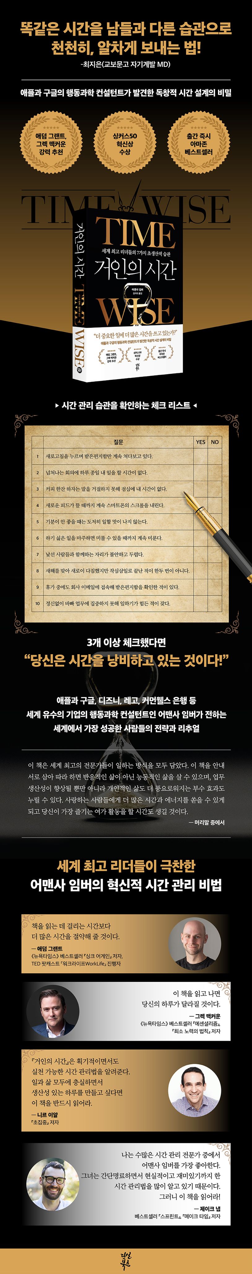 어맨사 임버도 몇 년 전까지는 수많은 직장인과 비슷한 삶을 살았다. 그러다 보니 쳇바퀴처럼 흘러가는 일상에 의문을 가지게 되었다. ‘이렇게 일하는 것이 최선이었을까?’ 그는 더 이상 받은편지함의 노예로 살고 싶지 않았다. 퇴근할 때는 의미 있는 일을 끝냈다는 벅찬 느낌을 받으며 하루를 마무리하고 싶었고, 매일 정시에 퇴근해 사랑하는 가족과 함께 저녁 식사를 하고 싶었다. 시간에 질질 끌려가는 삶에서 벗어나 주도적으로 시간을 쓰며 보람차고 행복한 삶을 살고 싶었다.
