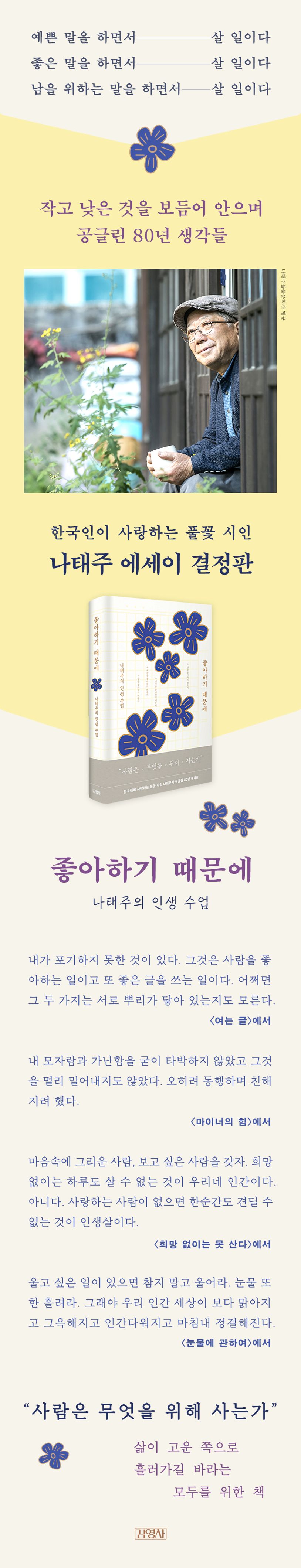 그렇게 탄생한 책의 제목 《좋아하기 때문에》는 그가 자주 쓰는 언어 중 하나인 ‘좋다’에서 착안했다. 평범한 언어지만 굳은 일상에 간지럼을 태워 미소 짓게 하는 말, 《좋아하기 때문에》는 칼이 되지 않고 꽃이 되는 삶을 꾸려가길 바라는 시인의 깊은 뜻이 들어 있을 테다. 부제는 ‘나태주의 인생(人生) 수업’이다. 달리 쓰면 ‘나태주의 일생(日生) 수업’인데, 80년간 하루하루를 충실히 살아온 충만한 생각을 조곤조곤 들려주기 때문이다.