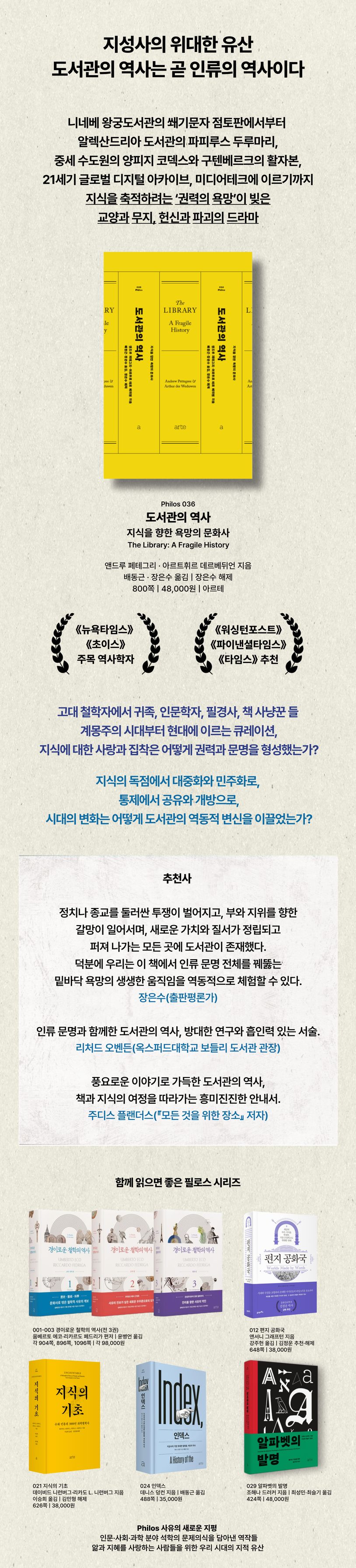 책과 미디어 환경 변화를 분석하며 커뮤니케이션 분야 권위자로서 지난 20년 동안 유럽 인쇄물의 역사를 연구해 온, 앤드루 페테그리와 아르트휘르 데르베뒤언은 『도서관의 역사(The Library: A Fragile History)』(필로스 시리즈 36번)에서 인류의 지적 자산을 보관하고 전승해 온 장소로서 도서관이 어떻게 발전하고 변화해 왔는지를 탐구한다.