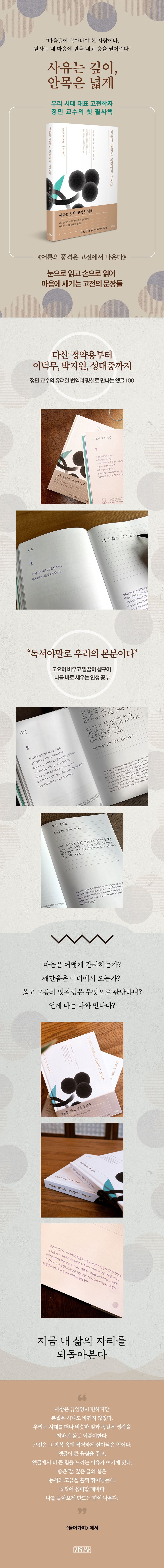 “세상은 끊임없이 변하지만 본질은 하나도 바뀌지 않았다. 우리는 시대를 떠나 비슷한 일과 똑같은 생각을 쳇바퀴 돌듯 되풀이한다. 고전은 그 반복 속에 씩씩하게 살아남은 언어다. 옛글이 큰 울림을 주고, 옛글에서 더 큰 힘을 느끼는 이유가 여기에 있다. 좋은 말, 깊은 글의 힘은 동서와 고금을 훌쩍 뛰어넘는다. 곱씹어 음미할 때마다 나를 돌아보게 만드는 힘이 나온다.” _〈들어가며〉에서