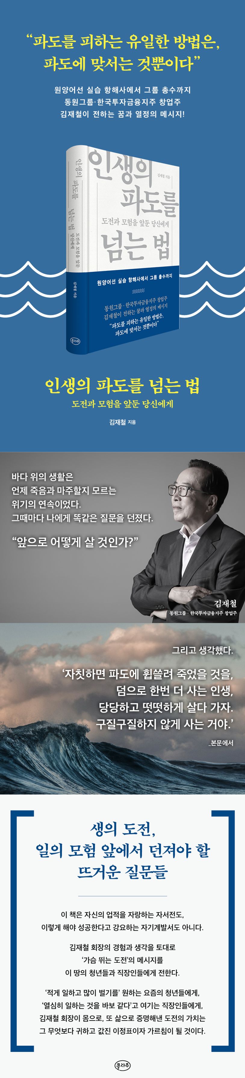 이 책 『인생의 파도를 넘는 법』은 자신의 업적을 자랑하는 자서전도, 이렇게 해야 성공한다고 강요하는 자기계발서도 아니다. 김재철 회장의 경험과 생각을 토대로 ‘가슴 뛰는 도전’의 메시지를 이 땅의 청년들과 직장인들에게 전한다.