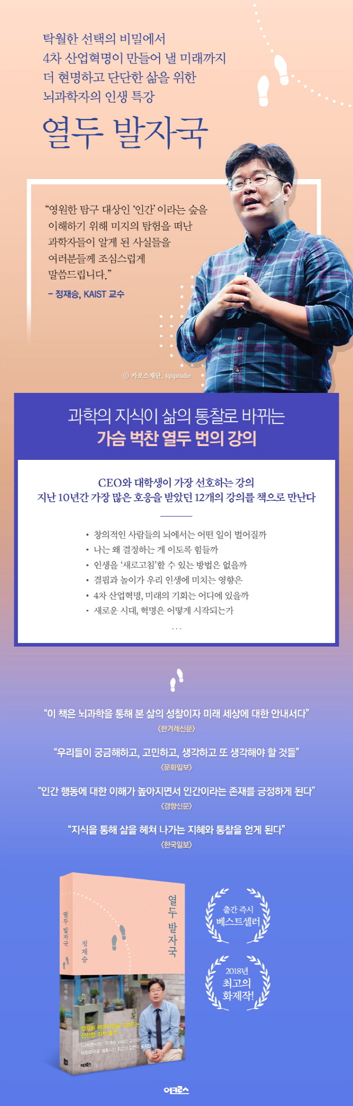 정재승의 강연은 가보지 않았던 새로운 생각의 숲으로 이끄는 발자국이다. 그의 발자국을 따라 들어간 숲에서 청중들은 ‘과학 지식이 삶과 세상에 대한 통찰과 지혜로 바뀌는 경험’을 하게 된다. 대한민국의 청년들에서부터 조직의 리더들까지, 세대와 성별을 넘어 많이 이들이 그의 이야기에 귀 기울이는 까닭이다.