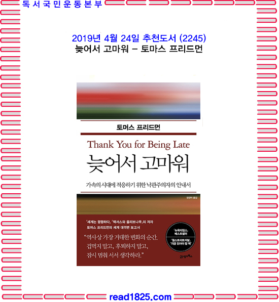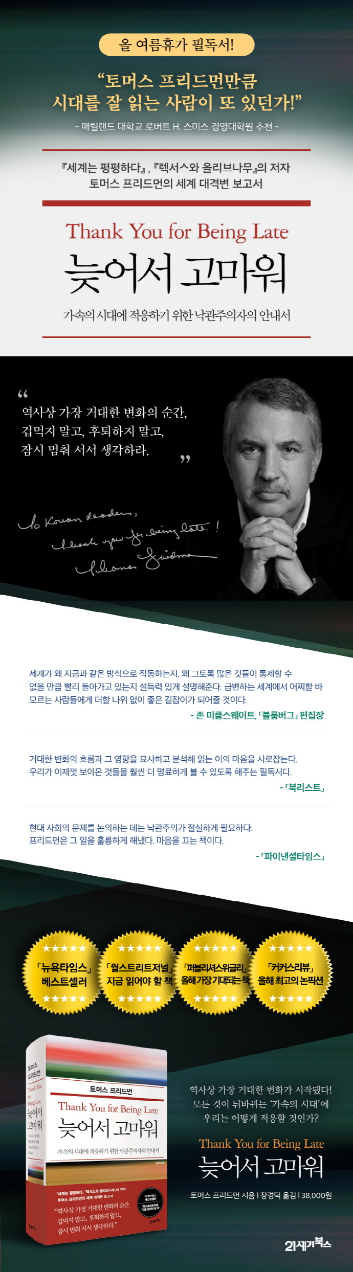 세계는 변화를 멈추지 않을 것이다. 우리는 미래에도 여전히 가속의 시대에서 살아가야 한다. ‘좋았던 옛 시절’을 떠올리며 변화의 속도를 멈추려 들 때 우리에게 주어지는 건 번영이 아닌 도태뿐이다. 그런 의미에서 역사상 가장 거대한 변화에 대해 다루고 있는 이 책 『늦어서 고마워』는 가속의 시대에 살아남을 방법을 모색하는 한 사람의 개인뿐 아니라 국가를 좌지우지하는 정치 지도자와 기업을 운영하는 비즈니스 리더 모두가 읽어야 할 강력한 필독서다. 프리드먼은 또한 인간이 따라잡을 수 없는 속도로 변하는 시대에 직업을 유지하기 위해서는 평생 다시 배워야(relearning) 한다고 말한다. 더욱 더 우리가 책을 열심히 읽어야 하는 이유다.