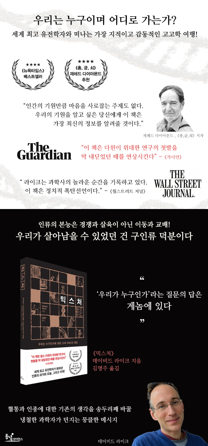이 책은 현장에서 일하는 유전학자가 이 새로운 과학의 발전 과정을 쉽고 간명하게 제시하며 그것이 어떻게 기존의 학설들을 뒤흔들어 놓았는지 흥미진진하게 설명한다. 《네이처》가 선정한 세계에서 가장 중요한 과학자 데이비드 라이크의 야심찬 첫 저작인 이 책은 출간 즉시 《뉴욕타임스》 베스트셀러에 이름을 올렸으며, 제레드 다이아몬드의 극찬을 받아 큰 화제를 모았다. 유려한 문체와 감동적인 메시지로 ‘고대 DNA 혁명의 최전선에서 보내온 편지’라는 호평을 받기도 한 이 책은 인류의 기원과 차별의 역사에 관한 우리의 상식을 완전히 뒤집어놓을 것이다.