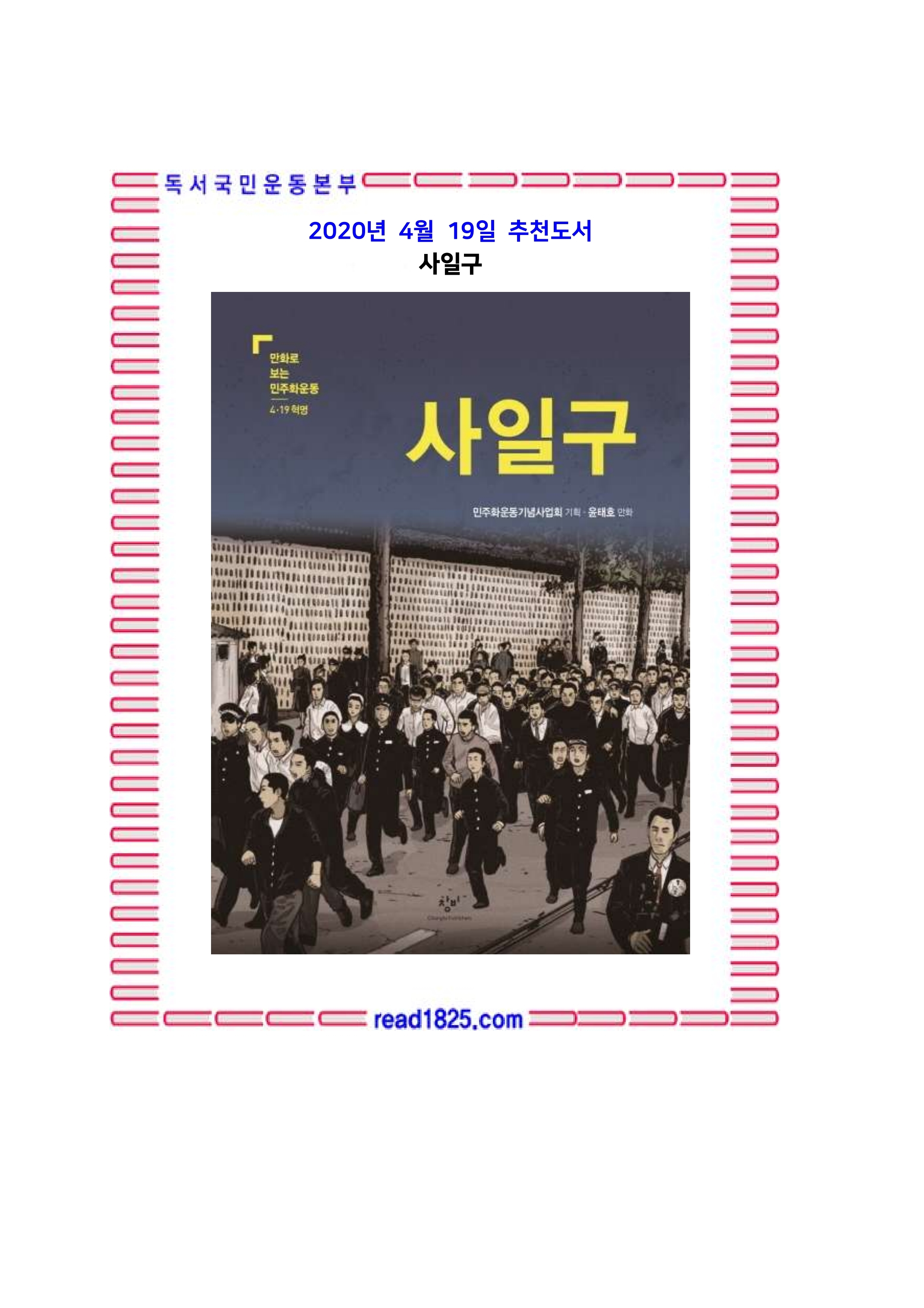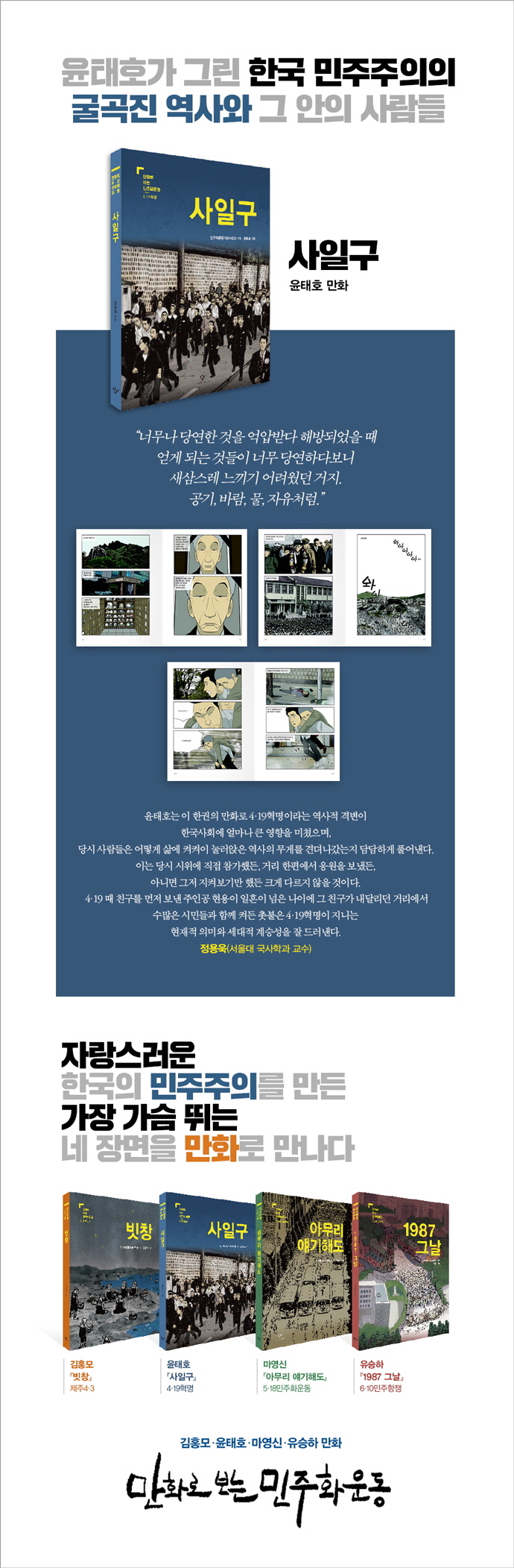 1960년 4월 19일, 학생들과 시민들이 3ㆍ15부정선거와 이승만의 독재에 반대하며 민주주의 혁명을 일으켰다. 식민통치와 해방, 전쟁과 분단을 경험하며 당장의 생존을 위해 애써야 했던 사람들은 어떻게 그처럼 적극적으로 민주주의를 외칠 수 있었을까? 윤태호의 『사일구』는 일제강점기부터 4ㆍ19혁명까지, 굴곡진 한국 근현대사를 한 호흡으로 고스란히 녹여내며 민주주의의 성장과 그 안의 사람들에 주목한다. 역사에 기록되지 않은 수많은 이들에게 과연 4ㆍ19혁명이란 무엇이었는지 질문하는 이 작품은 주인공 현용의 생애로 그 대답을 제시한다. 우리 시대를 대표하는 만화가 윤태호의 노련한 연출과 구성, 탄탄한 스토리 속 묵직한 메시지가 돋보인다.