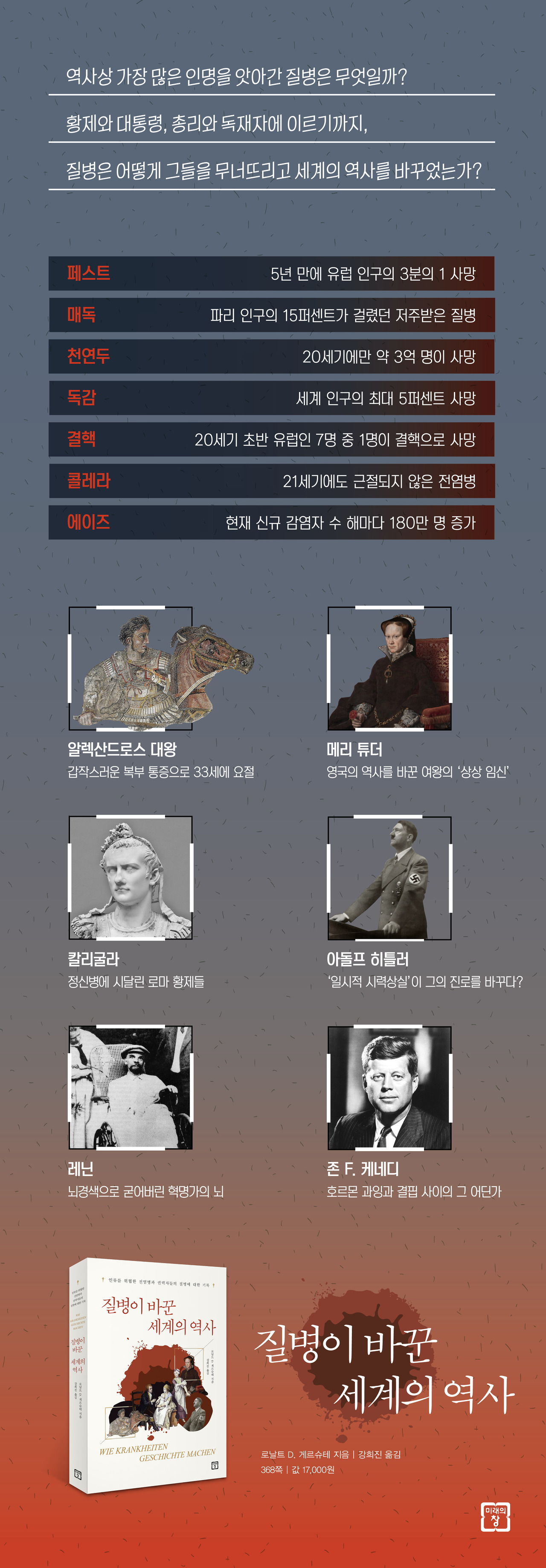 질병과 역사의 물결 사이에는 모종의 상관관계가 존재한다. 14세기 중반 흑사병이라 불리던 페스트가 창궐하면서 유럽 인구 3분의 1이 사망했다. 그로 인해 발생한 사회적, 경제적 여파에 대해서는 상세한 연구들이 진행된 바 있다. 그런데 그러한 거시적 관점도 중요하지만 미시적 관점, 즉 역사의 물줄기를 좌지우지할 만큼의 결정권을 지닌 정치가들 개개인이 겪어야 했던 고통과 뜻밖에 찾아 온 죽음에 대해서도 한 번쯤은 다루고 넘어가야 할 것이다. 물론 다수의 역사학자들은 거물급 정치가 한 사람이 역사의 진행 방향을 좌우할 수는 없다고 주장한다. 그러나 많은 사람들이 히틀러가 없었다면 20세기의 유럽사는 분명 달라졌을 것이라고 상상하고, 미하일 고르바초프Mikhail Gorbachev가 1985년 소련 공산당 서기장에 선출되지 않았더라면 냉전 시대가 평화롭게 종식되지 않았을지도 모른다고 생각한다. / 8P