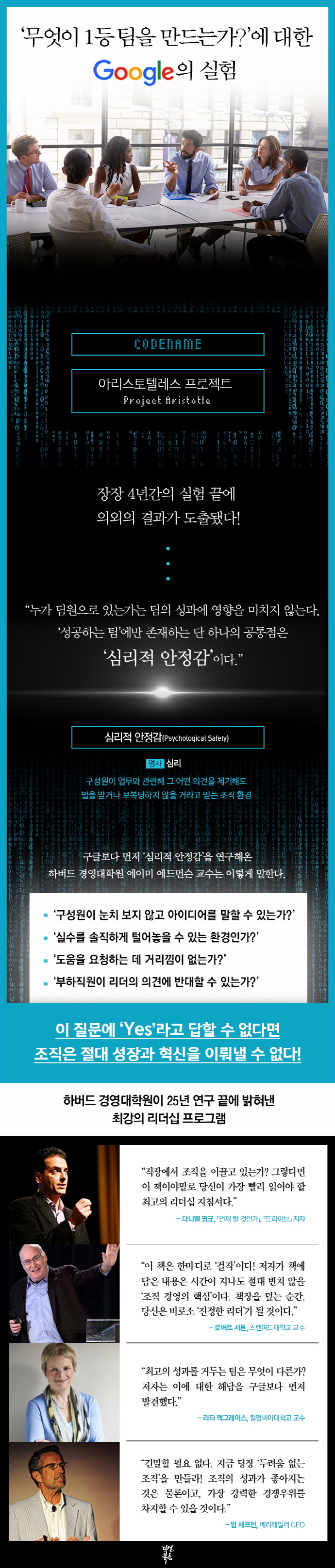 실패한 팀에 보너스를 주는 특단의 조치로 심리적 안정감을 강화하고 있는 구글. 리더가 나서서 안전한 실패를 할 수 있는 환경을 조성하고, 구성원들이 자유롭게 문제를 제기하고 개선해갈 수 있는 기회를 얻는 것이 구글의 성장 원동력이 되고 있다. 이처럼 구글과 같은 세계적인 기업부터 소규모 공장까지 수천 개의 조직을 분석해 도출한 저자의 연구 결과는 혁신과 성장을 꿈꾸는 모든 조직의 리더에게 훌륭한 길잡이가 되어줄 것이다.