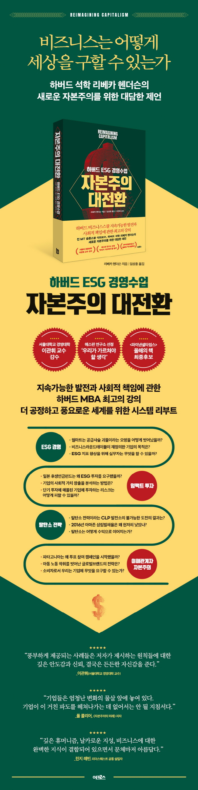 하버드 석학 리베카 헨더슨의 《자본주의 대전환》이 출간됐다. 저자의 하버드 비즈니스스쿨 강의 ‘자본주의 다시 상상하기(Reimagining Capitalism)’를 토대로 쓴 책으로, 극심한 불평등과 생태적 과부하를 낳은 자본주의를 지속 가능한 형태로 전환하는 길을 제시한다. 〈포천〉이 “COVID-19가 이 책에 담긴 논의의 시급성을 일깨워주었다”라고 평했듯, 저자가 강조하는 ‘이해관계자 자본주의’ ‘ESG 경영’ 등은 이제 당장의 경제·환경·사회 위기를 타개하는 데 없어서는 안 될 키워드가 되었다. 개설 당시 수강생이 28명에 불과했던 강의가 이제는 하버드 비즈니스스쿨 학생 2명 중 1명이 듣는 필수강의로 자리매김한 것 역시 이를 방증한다. 경제학·심리학·조직행동학을 아우르는 엄밀한 연구와 더불어 그녀 자신이 기업들의 변화를 이끌고 참여해온 최전선에서의 경험이 풍부하게 담겼으며, 기업·투자자·정부 등 전방위적 차원에서 도입 가능하고 시민이 요구할 수 있는 실질적 혁신 전략들을 전한다.