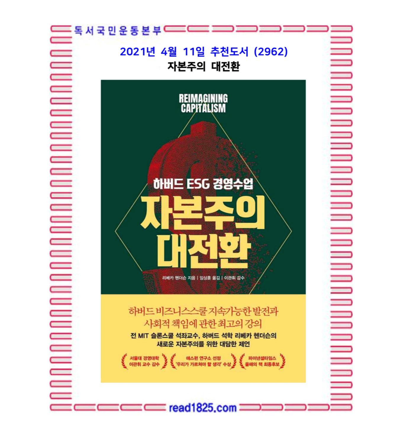 “리베카 헨더슨은 연구과 개인적인 경험을 날줄과 씨줄로 삼아 명료하면서도 계시적인 전망을 전한다. 기업은 오늘날 가장 어려운 이슈를 주도함으로써 자신은 물론 사회에도 많은 이익을 가져다줄 수 있다. 읽고, 희망을 느껴보라.”