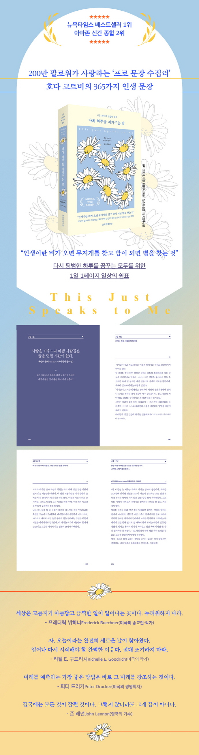 유명 방송인이자 기자, 그리고 200만 팔로워의 공감을 불러일으킨 ‘명언 수집러’ 호다 코트비는 좋은 말에는 사람의 마음을 움직이는 힘이 있다고 믿는다. 그리고 그녀가 매일 하루에 하나씩 모아온 문장들은 이미 수많은 사람들의 하루를 바꾸고, 인생을 변화시켰다. 부정적 감정에 빠져 스스로에게 필요한 말이 무엇인지조차 모르겠다면, 힘겨워하는 가족, 친구, 연인을 위한 적절한 말을 찾아내기 어렵다고 느껴진다면 이 책을 추천한다. 저자가 코로나 시대를 겪으면서 모은 365개의 따뜻하고 위트 있는 문장들은 우리와 우리가 사랑하는 사람들을 구하고, 일상의 행복을 되찾는 방법을 알려줄 것이다. 365쪽이나 되는 페이지 속 어딘가에 위로의 역할을 하거나 적어도 잠시나마 마음을 토닥일 문장 하나, 또는 이야기 하나 정도는 있지 않을까?