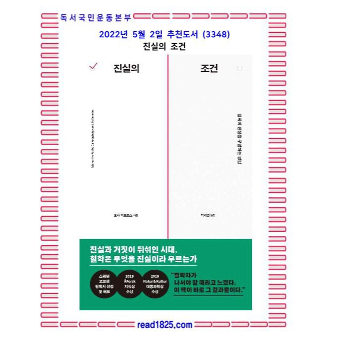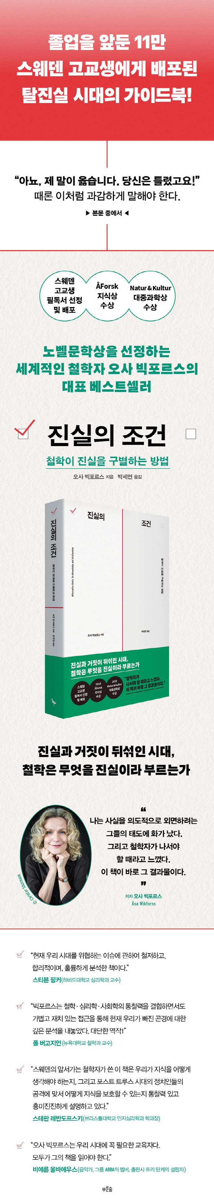 진실이란 과연 무엇일까? 저자는 철학이 지난 수천 년간 논의해온 진실의 정의를 짚어가며 그 해답을 찾는다. 그리고 심리, 사회, 언어학의 관점에서 ‘진실의 적’들이 어떻게 우리를 속였는지, 왜 우리가 그들에게 속을 수밖에 없었는지 밝히고 돌파구를 제시한다. ‘진실’과 관련한 철학·심리학·사회학·언어학 등 거의 모든 인문학적 지식을 집약한 《진실의 조건》은 스웨덴에서 출간과 동시에 베스트셀러 자리에 올라 유수의 사회과학상을 수상하였으며, 스티븐 핑커를 비롯한 전 세계 지식인들로부터 수많은 찬사를 받았다. 또한, 탈진실 시대를 헤쳐 나갈 미래 세대의 가이드북으로 선정되어 11만 명의 고등학교 졸업반 학생들에게 무상 제공되는 등 사회 전반에 큰 영향을 끼쳤다. 특히 정치적 견해가 극도로 양극화된 오늘날 한국의 독자들이 ‘진짜’ 진실을 구별해내는 데 필수적인 도움을 줄 것이다. 지금이 바로, 철학으로 진실을 가려낼 때다.