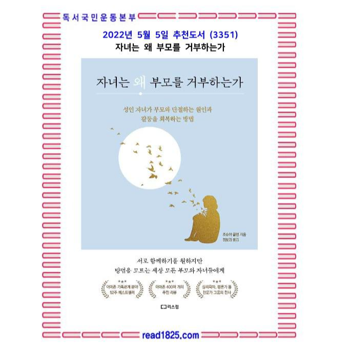 우리 사회의 부모 자식 간 관계 단절의 모든 것을 너무나 완벽하게 설명하는 정말 좋은 책! 강추!! 지난 11년간 이 문제로 고통받아온 나에게 이처럼 도움을 준 책은 없었다. 자녀가 어릴 때 읽는다면 성장한 아이로부터 거부당하는 불행을 피할 수 있을 거라고 확신한다. - 수잔 콜린스 미국