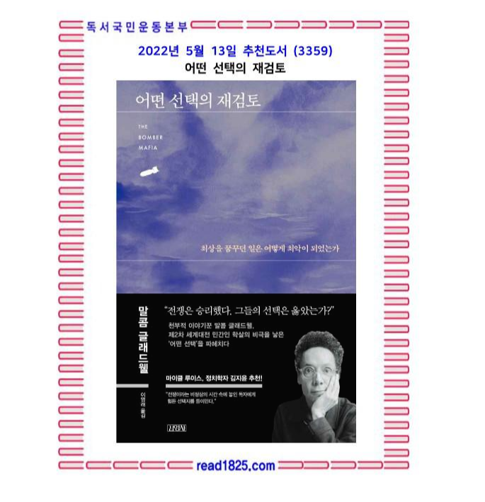 《어떤 선택의 재검토》(원제: The Bomber Mafia)는 최상을 꿈꾸었으나 최악의 결말로 치달은 선택에 관한 이야기다. 말콤 글래드웰은 당시 미군 지휘부가 도쿄 대공습을 결정하기까지 과정을 재검토함으로써 이상과 현실, 의도와 선택의 괴리를 보여준다. ‘폭격기 마피아(Bomber Mafia)’라고 불리던 미 육군항공대 지휘관들은 인간의 가장 추악한 광기가 드러나는 전쟁에서 일말의 인간다움을 지키려고 했지만, 그 이상은 민간인 대량 살상이라는 결과로 이어지고 말았다. 폭격기 마피아가 꿈꾼 ‘윤리적 전쟁’은 존재하는가? 왜 의도와 선택은 어긋나는가?