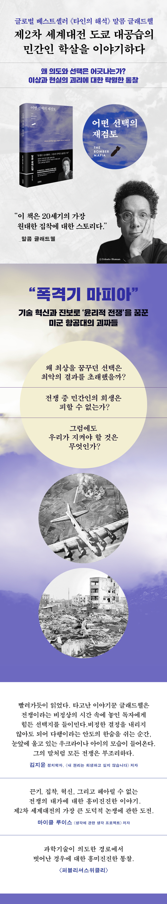 《타인의 해석》 《아웃라이어》 《티핑 포인트》 등 글로벌 베스트셀러를 자랑하는 최고의 저술가 말콤 글래드웰이 제2차 세계대전의 결정적 순간을 다룬 역사 논픽션으로 돌아왔다. 1945년 미군의 ‘도쿄 대공습’이라는 민간인 학살의 비극을 파헤치며 ‘같은 의도에서 출발한 정반대의 선택’을 재검토한다.