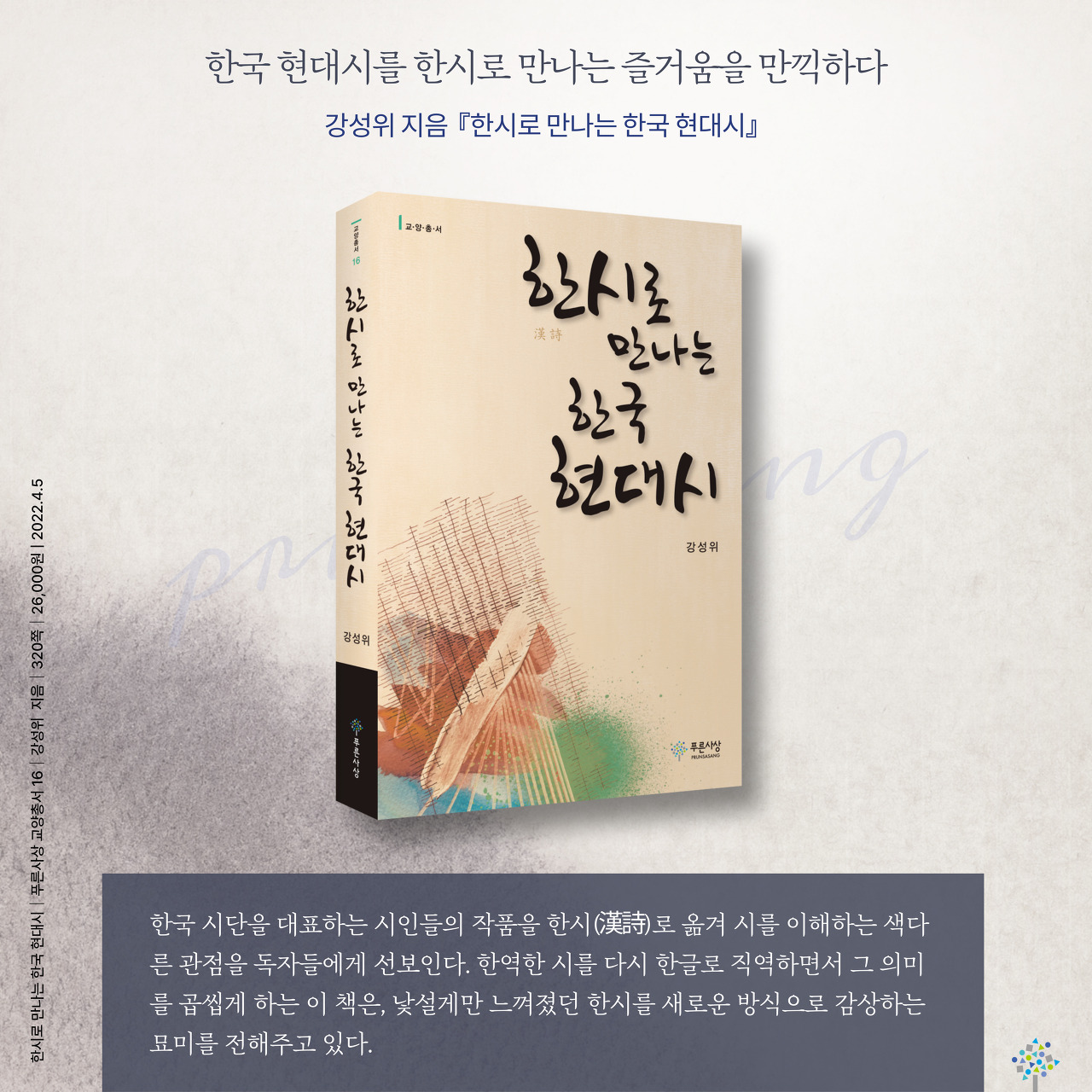 한문학자 강성위의 『한시로 만나는 한국 현대시』가 푸른사상사의 〈교양총서 16〉으로 출간되었다. 한국 시단을 대표하는 시인들의 작품을 한시(漢詩)로 옮겨 시를 이해하는 색다른 관점을 독자들에게 선보인다. 한역한 시를 다시 한글로 직역하면서 그 의미를 곱씹게 하는 이 책은, 낯설게만 느껴졌던 한시를 새로운 방식으로 감상하는 묘미를 전해주고 있다.