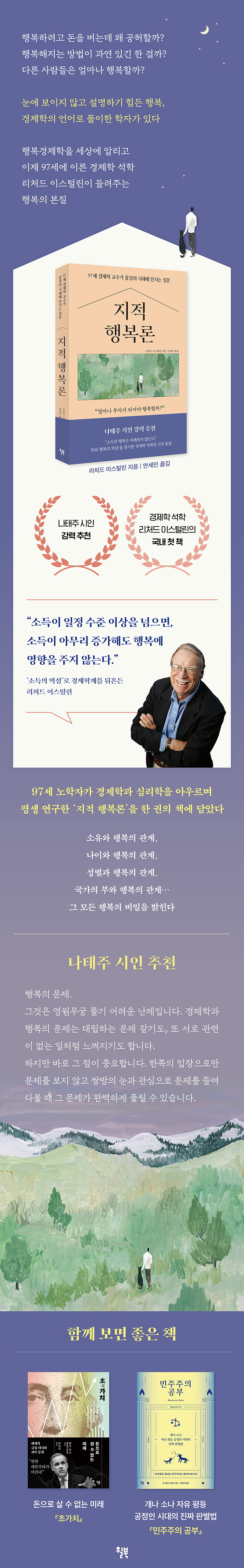 『지적 행복론』은 어느덧 97세가 된 경제학 석학이 50년 가까이 헌신한 행복경제학의 모든 것을 총정리한 책이다. 그가 행한 일련의 행복 연구가 지적 행복론인 셈이다. 이스털린은 최근 몇 년간 학교에서 진행한 행복경제학 강의를 바탕으로 이 책을 썼다. 책을 읽고 있으면 실제로 교실에 앉아 수업을 듣고 있는 학생이 된 것처럼 노교수의 친절한 수업을 따라가게 된다. 행복경제학에 대한 가장 쉽고 친절한 입문서로 손색이 없는 것은 물론이고, 행복해지고 싶은 모든 이들을 위한 훌륭한 대중 교양서로 오랫동안 사랑받을 책이다.