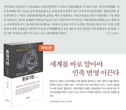 시인이자 통일운동가인 태종호(太宗鎬) 한민족통합연구소 대표의 신간 『통일기행(統一紀行)』 ‘국내편’과 ‘국외편’ 2권이 도서출판 “한누리미디어”에서 출간되었다. 이 책은 저자가 오랫동안 통일부 통일교육위원으로 활동하면서 ‘남북문제’와 ‘통일문제’의 근원적 해법을 찾기 위해 고심하며 활동했던 30여년의 역정(歷程)을 진솔하게 기록한 서사적(敍事的) 자전적(自傳的) 기행문(紀行文)이다.