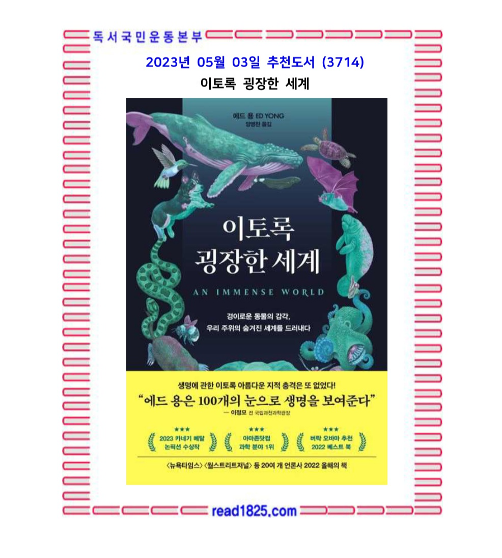 이 책에 등장하는 과학자들은 동물의 삶을 그들의 감각이 아닌 우리의 감각으로 재단하는 것을 경계하며, 동물의 감각을 연구하는 일은 어렵고 겸손을 요구한다고 말한다. 하지만 동물의 환경세계를 조금씩 더 이해하게 될 때면 감탄의 목소리로 이렇게 외친다. "우리는 다른 행성에서 온 외계인을 찾을 필요가 없어요. 바로 옆에 세상을 전혀 다르게 해석하는 동물들이 있으니 말이에요!"(동물 시각 연구자 엘리자베스 제이콥) 에드 용은 생물학의 최전선에서 분투하는 연구 현장의 이야기부터 동물의 눈을 통해 세상을 경험하려고 노력하는 연구자들의 마음까지 생생하고 유쾌하게 담아냈다.