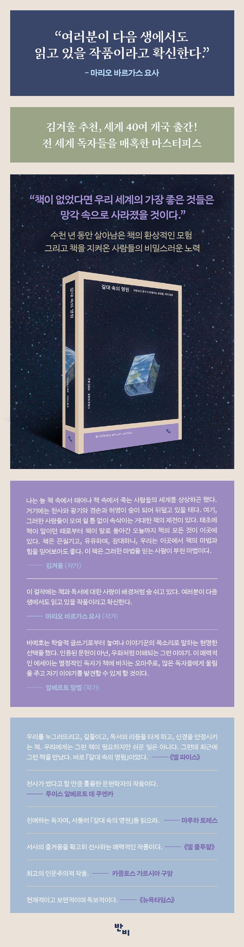 책, 독서, 도서관의 역사를 다룬 책은 무수히 많다. 테크놀로지의 발전, 새로운 매체의 등장으로 책은 곧 사라질 것이라는 묵시록적 예언에 반박하는 책도 무수히 많다. 그러나 『갈대 속의 영원』은 단순한 역사책도 아니고, 책의 중요성에 대한 당위적인 주장도 아니다. 일찍이 『독서의 역사』 등으로 이 장르를 일군 대가 중 한 명인 알베르토 망겔이 언급하듯, 바예호는 “이야기꾼의 목소리”로 말하기를 선택한다. 이 천부적인 스토리텔러는 세계화를 꿈꾼 알렉산드리아 도서관의 비전부터 말(구전성)과 글(문자언어)의 싸움, 번역의 탄생, 복제와 상업화를 통해 평범한 사람들에게 이루어진 책의 전파까지 무수한 에피소드를 넘나들며 잘 알려진 역사의 새로운 판본을 엮어낸다. 여기에 “모든 시대의 무국적자를 위한 종이의 나라”(318쪽)에서 비로소 존중을 맛본 왕따 어린이였던 저자의 경험, 서슬 퍼런 프랑코 정권 아래에서 『돈키호테』로 시작하지만 두 번째 장부터는 『자본론』이 접붙여진 책으로 금서를 읽었던 부모님의 기억이 겹쳐지며, 독자들 저마다가 간직해온 책과 나눈 이야기로 이끈다.