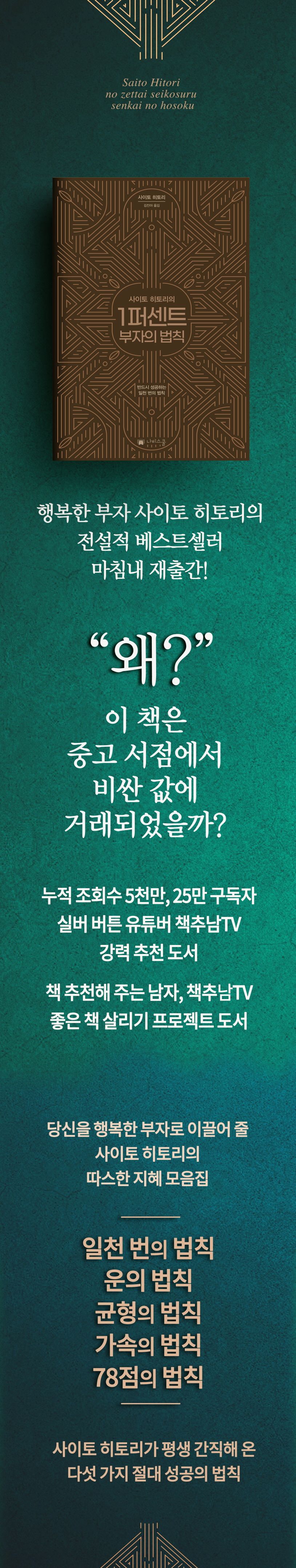 그가 알려주는 다섯 가지 법칙은 매우 쉽다. 그리고 유쾌하다. 이 책에는 사이토 히토리가 중요하게 여기는 인생의 지혜가 담뿍 담겨 있다. 단순하지만 명료한 이 한 권으로 우리는 평생 지켜갈 부의 원칙을 깨달을 수 있다.
